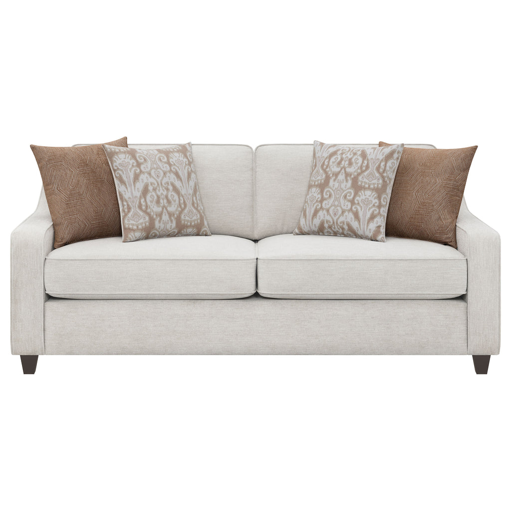 Brighten your living space with this upholstered sofa wrapped in soft beige chenille. Designed for comfort and elegance, it features gently sloped track arms and tall tapered wooden legs that create a refined transitional silhouette. The boxed seat and back cushions include classic welt trim for tailored appeal, while coordinating accent pillows in copper and coral tones bring subtle contrast. Built with a durable wooden frame and foam cushioning, this sofa blends timeless design with everyday comfort._x005F_x000D_ Key Features: • Upholstered sofa with refined transitional design and clean lines • Soft beige chenille upholstery adds light, inviting texture • Sloped track arms offer comfort with graceful modern shape • Boxed seat and back cushions feature classic welt detailing • Copper and coral accent pillows provide subtle contrast tones • Solid wood tapered legs ensure stability and timeless appeal