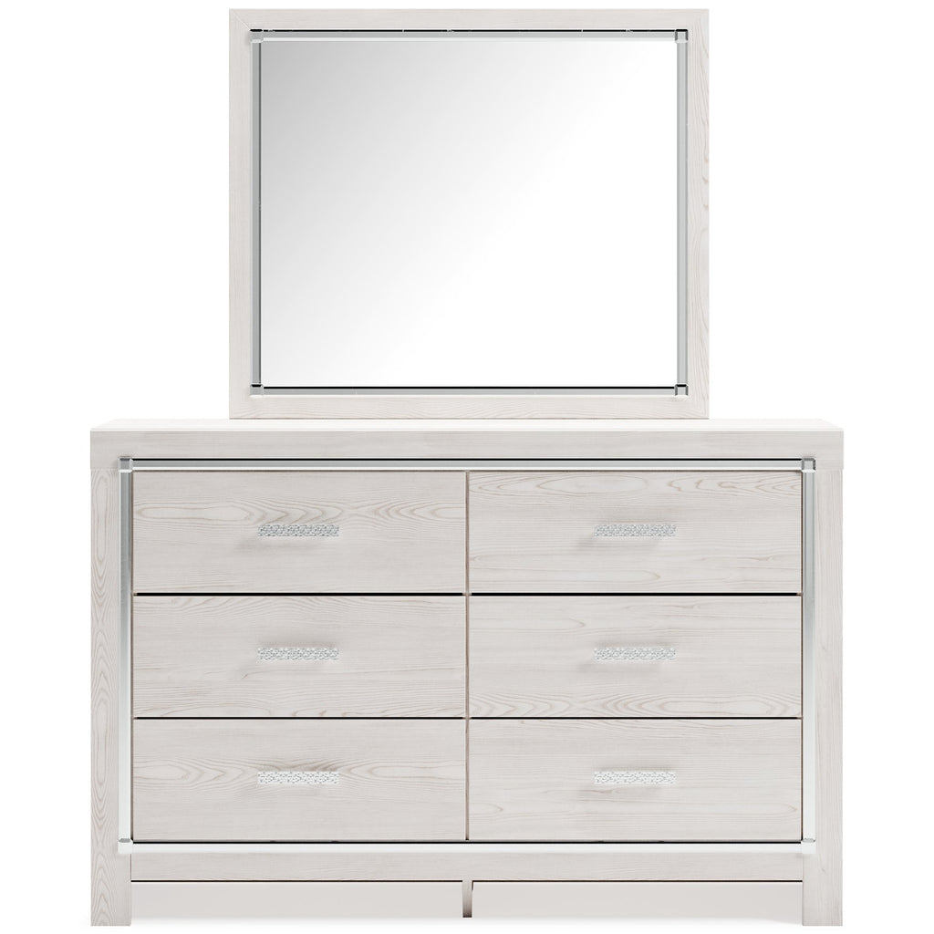 The epitome of fashion-forward design, this dresser with mirror set is a beautiful blend of comfort and luxury. Shiny chrome-tone accents, a pearlized finish and mosiac pulls bring a glam touch to the richly rustic appearance. Six smooth-gliding drawers provide plenty of storage space for your wardrobe needs.