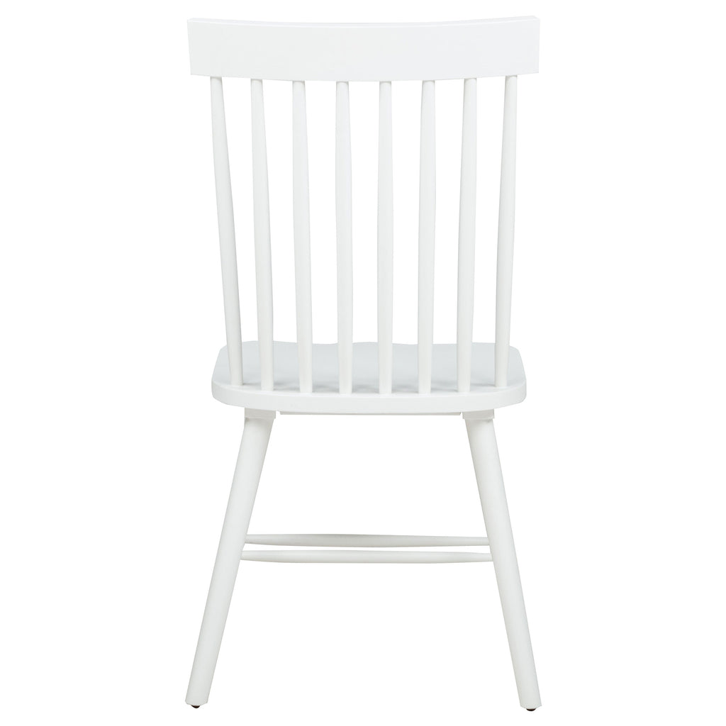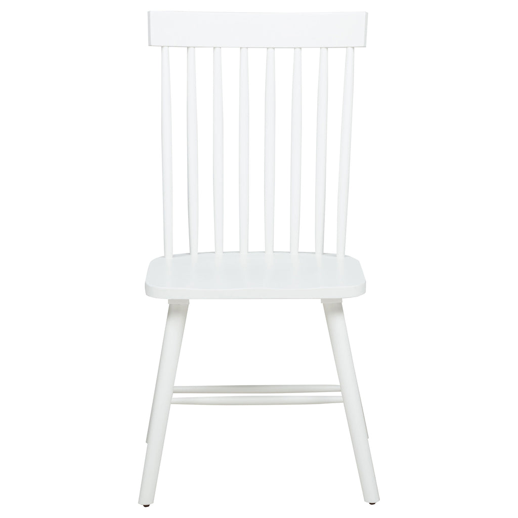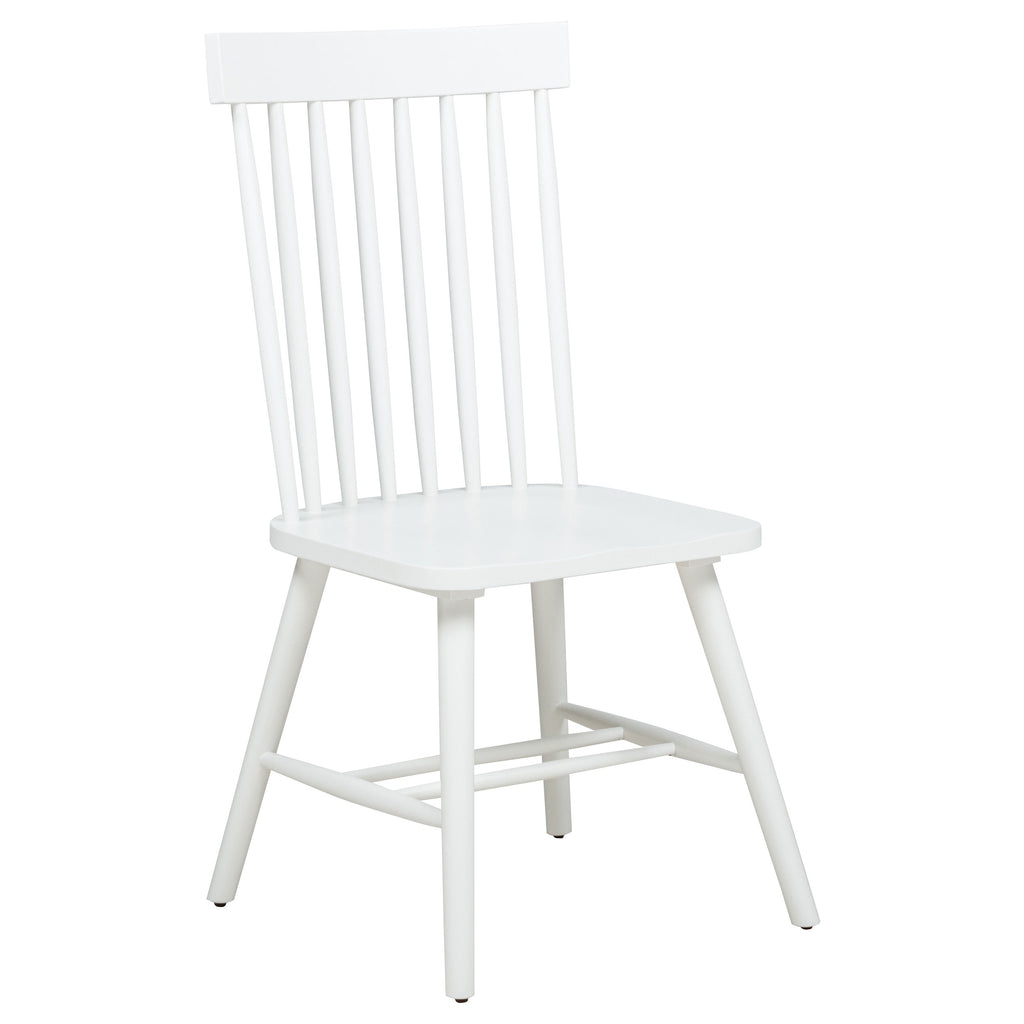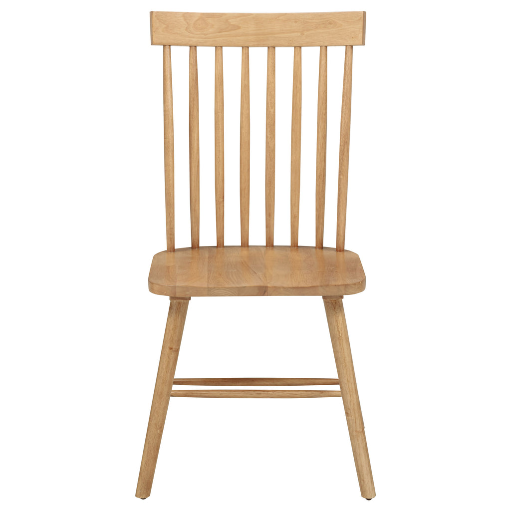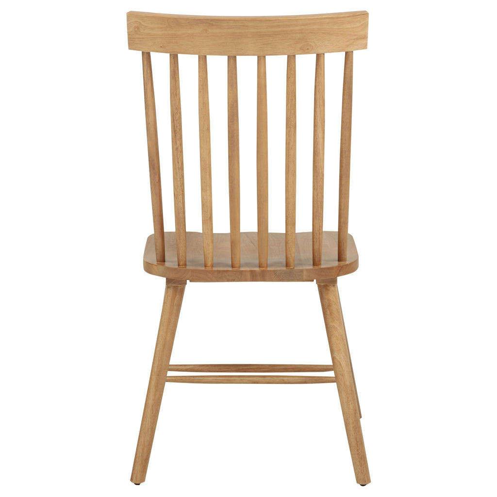 Classic and casual with a fresh farmhouse flair, this Windsor-style side chair features a high spindle back and gently contoured seat for timeless comfort. The clean silhouette is crafted from solid rubberwood with a rich wood veneer that enhances its natural grain. Angled legs with double stretchers offer reliable support and charm. Ideal for everyday dining, breakfast nooks, or cozy kitchen spaces. Key Features: • Windsor-style side chair in light ash finish offers timeless form with a farmhouse-inspired silhouette • Dining chair in light ash includes a tall spindle back and gently curved seat for classic comfort • Windsor backrest design promotes airy support and a traditional yet casual dining aesthetic • Contoured seat enhances comfort while angled legs provide a balanced and grounded profile • Double side stretchers deliver extra durability and everyday strength for long-term use • Crafted from solid rubberwood and finished in wood veneer for warmth, charm, and resilience