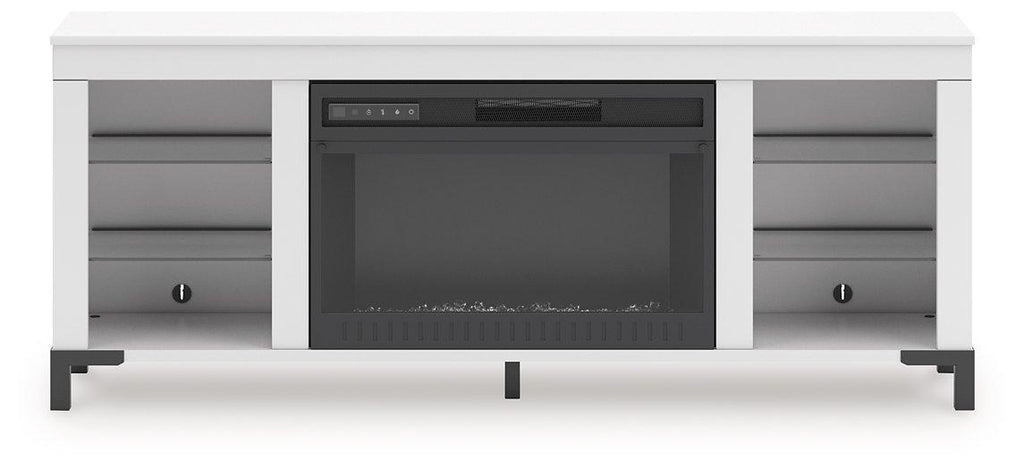 Level up your gaming experience and make movie nights to remember. This TV stand with electric fireplace extends your entertainment beyond the screen. Its built-in fireplace brings the heat, synchronizing with LED backlighting on the shelves. And you can customize the vibe with three trendy color options: blue, white and red. Modern function. Captivating, cool style. With this TV stand, revamp your home’s recreational hub like never before.