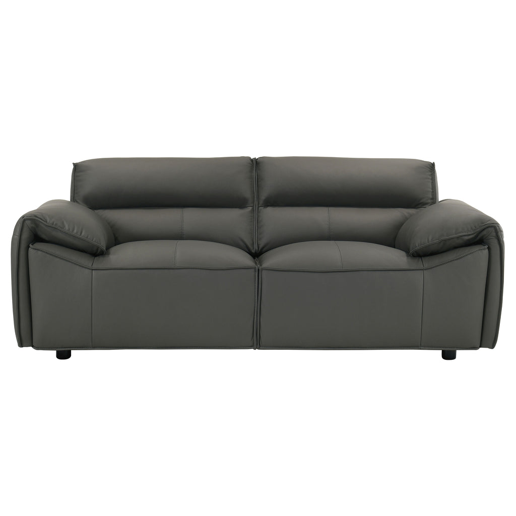 This leather-upholstered loveseat offers a perfect balance of sculptural simplicity and everyday luxury. Wrapped in 100% genuine top grain leather, it showcases smooth tailoring and a bold, low-profile silhouette. Wide, gently sloped arms and deep seats create an inviting feel, while high-density full foam cushions and a sinuous spring foundation provide lasting support. With its grounded form and refined materials, this piece brings quiet sophistication to any modern space. Key Features: • Loveseat upholstered in 100% top grain leather for a soft, luxurious hand and long-term durability • Low-profile frame with wide, sculpted arms creates a relaxed yet structured silhouette • High-density full foam seating offers plush comfort with excellent shape retention • Sinuous spring support system enhances flexibility and long-lasting resilience • Orange leather finish delivers bold contrast and timeless modern style • Perfectly scaled for pairing or standalone use in sophisticated living spaces