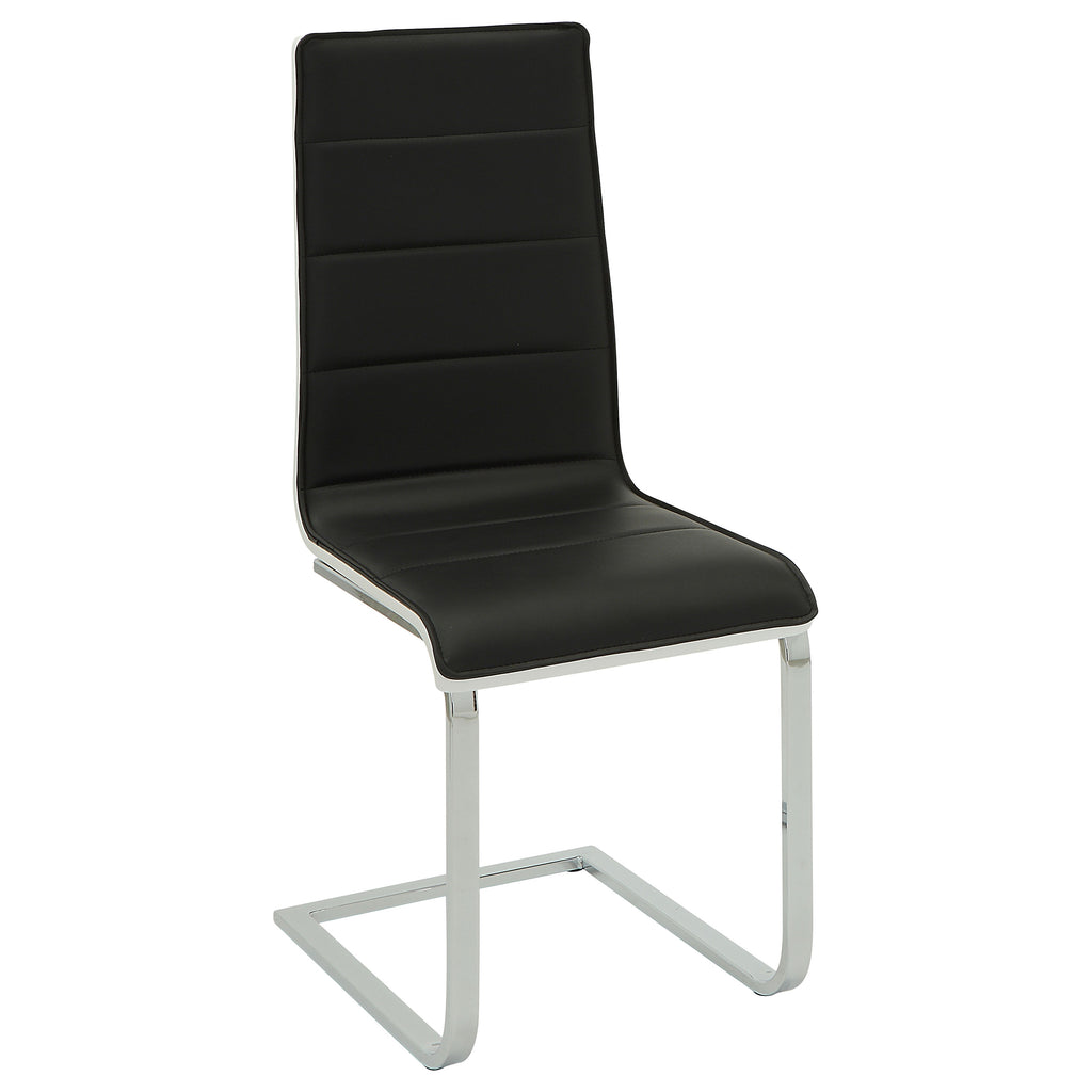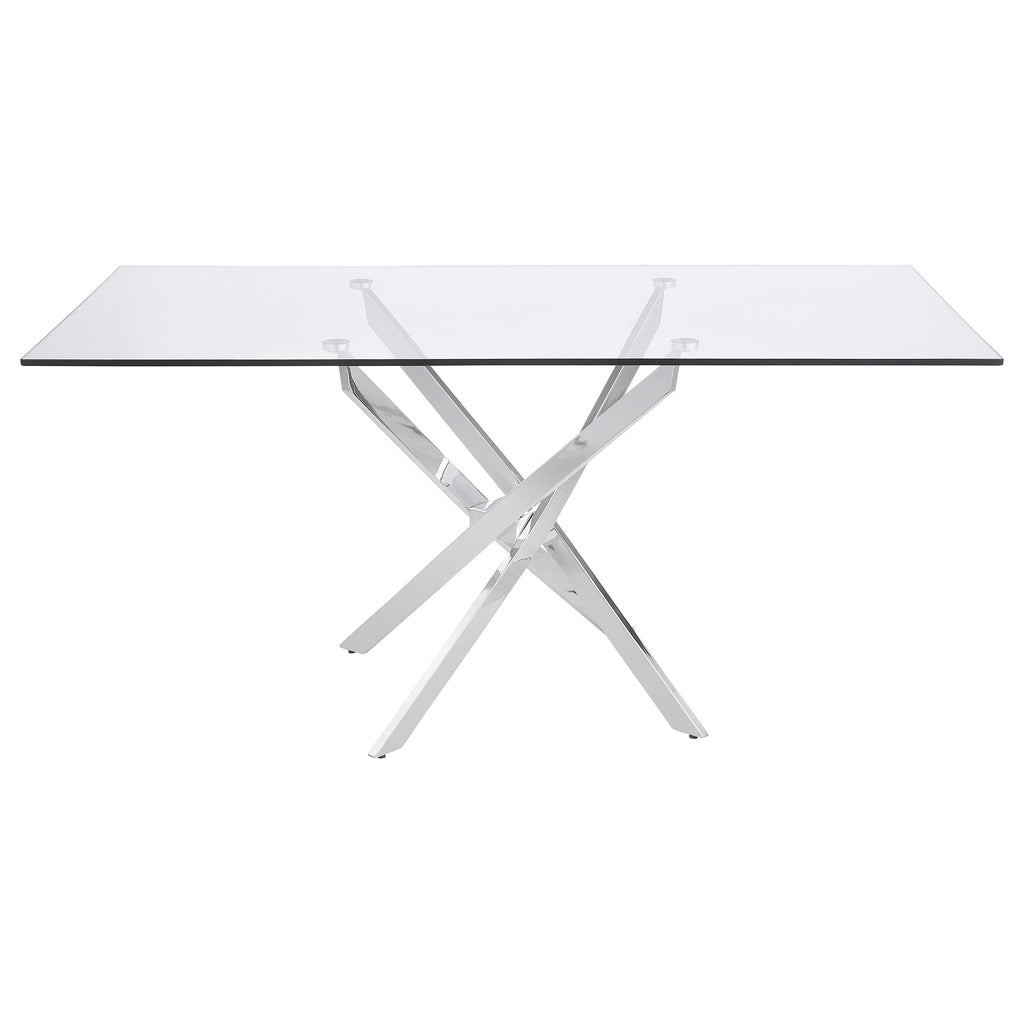 This contemporary five-piece dining set showcasing chrome and glass makes the perfect showpiece in a modern home. The set includes a rectangular glass table and four shapely chairs that are visually stunning. The rectangular extra thick tempered glass of the tabletop virtually “floats" on a chrome finish asterisk metal base that steals the show. The four chairs feature shapely lines and channel stitching in contrasting black and white leatherette for a stunning contrast. The base and legs are crafted with a lustrous chrome finish that imbues your dining space with glam and pizzazz.