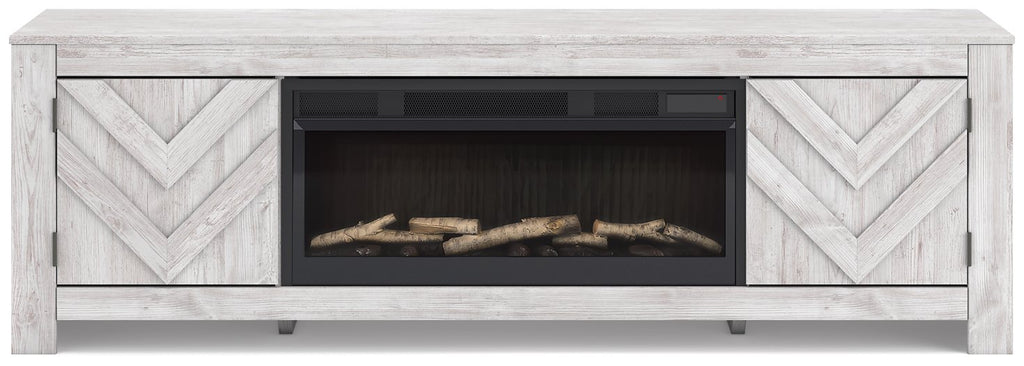 This TV stand with electric fireplace embraces a classically charming aesthetic and repurposes it for modern living. Its dark charcoal finish appeals to your love of vintage character, while a chic chevron pattern is effortlessly on trend. Media accessories stay tucked away in style thanks to hidden storage behind the doors. And for added ambiance, the electric fireplace brings a cozy-cool vibe to your living room. With the touch of a button, activate the LED-lit flame and adjust the temperature or the flame brightness. The flame effect includes multiple color options and a realistic-looking faux birch log set.