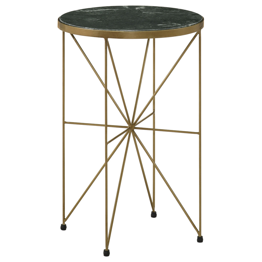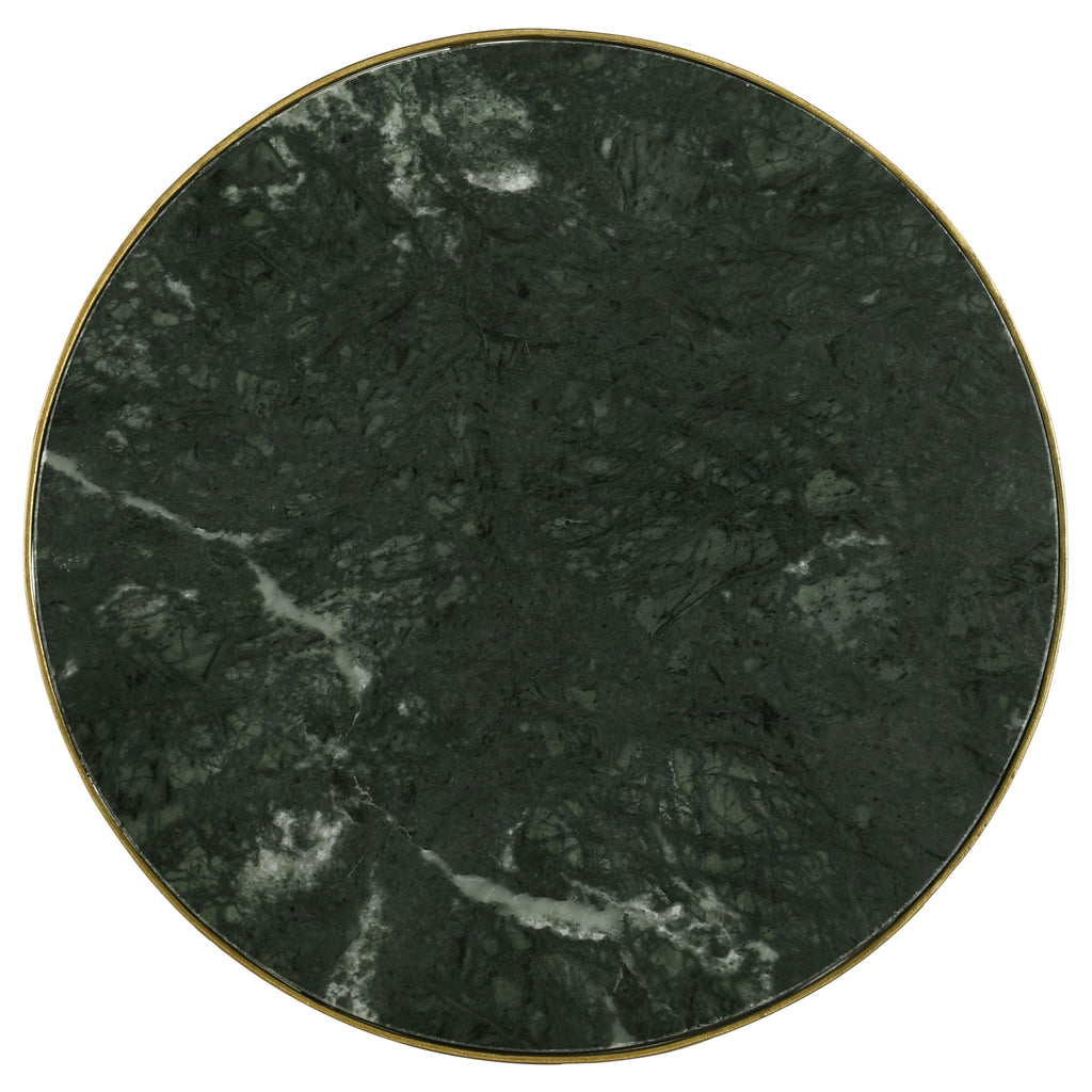 A stunning blend of contemporary elegance and classic sophistication, this round accent table adds a luxurious touch to any space. Featuring a solid green marble tabletop, inset within a warm antique gold-finished metal frame, this piece exudes refined glamour. The slim, geometric base creates an open, airy silhouette, making it perfect for compact spaces. Delicate teardrop-shaped feet with protective caps provide stability while adding a subtle decorative element. Ideal for modern, glam, and transitional interiors, this table serves as a stylish surface for décor, drinks, or statement pieces.