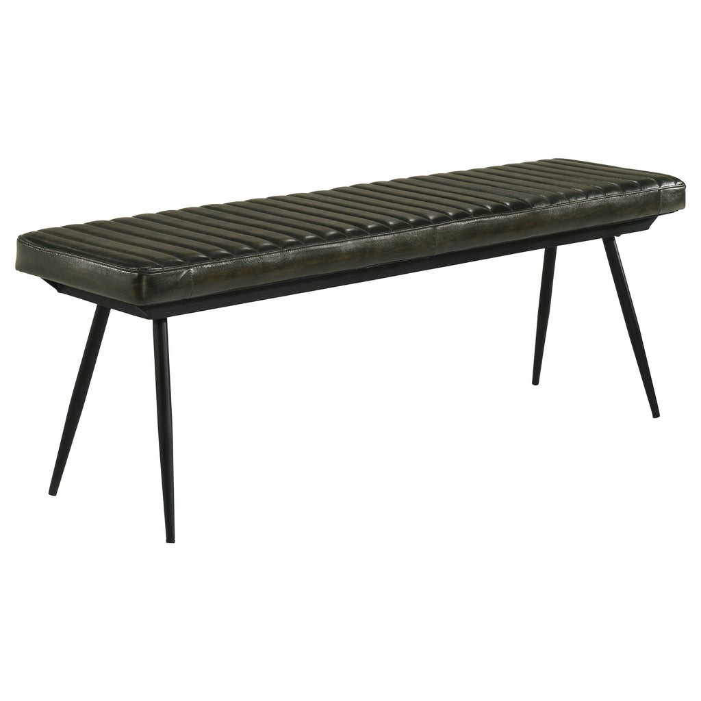 Blending rustic charm with industrial appeal, this dining bench is a bold yet versatile seating option. Upholstered in hand-dyed genuine goat leather, the padded seat with vertical tufting offers both comfort and durability. The sleek black metal base, featuring flared and tapered legs, provides a sturdy foundation with a modern edge. Designed to complement a variety of interiors, this bench is perfect for industrial, rustic, or contemporary dining spaces, offering both style and functionality. Key Features: • Dining bench with hand-dyed antique camel genuine goat leather upholstery • Padded seat with vertical tufting enhances comfort and vintage appeal • Sturdy black metal base with flared and tapered legs for stability • Strong metal frame ensures lasting durability for everyday seating • A stylish alternative to traditional chairs for a unique dining setup • Perfect for industrial, rustic, and modern farmhouse dining spaces