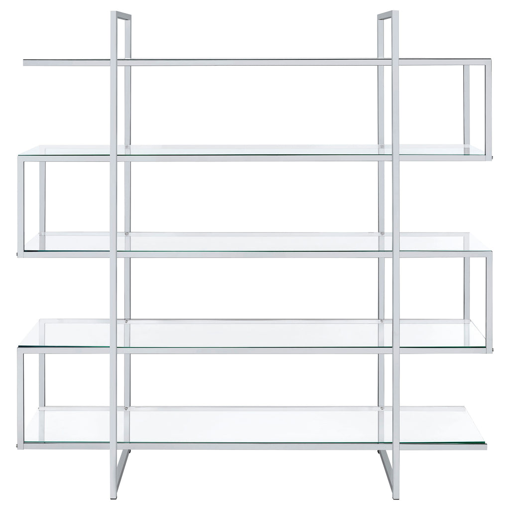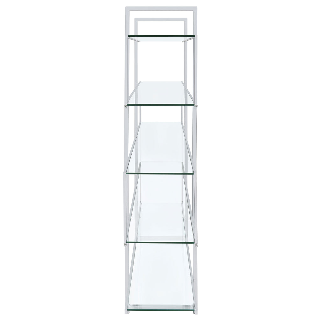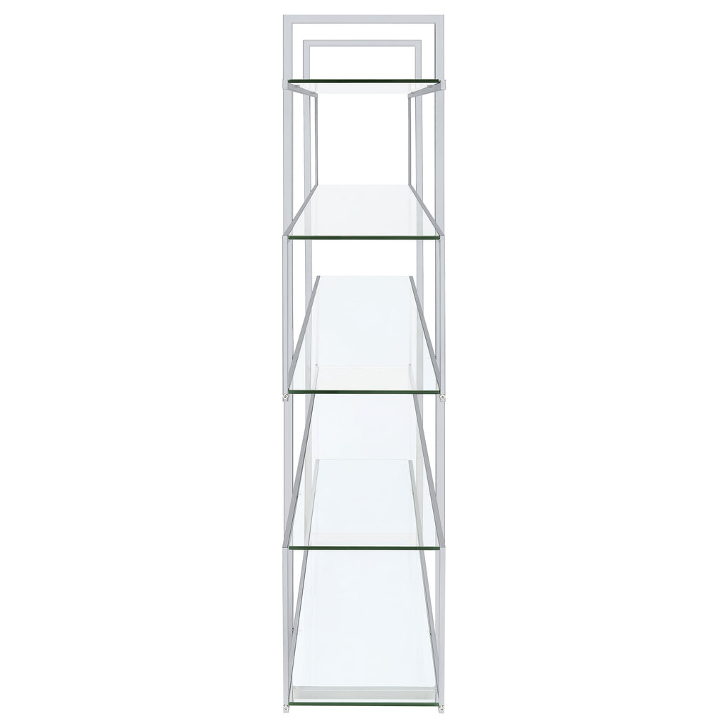 Jump on a trendy, modern bandwagon. Refresh a contemporary space with a stylish piece designed to organize and display. This four-tier bookcase offers a cool profile with personality. Tempered glass shelves blend perfectly with a steel frame. Make room for books, photos, and decor on this edgy, attitude-rich piece. Key Features: • Modern chrome and glass bookshelf with five clear tempered glass shelves • Polished chrome frame adds a sleek metallic accent to any space • Open tiered layout allows full access from all sides • Tempered glass shelves provide durable and transparent storage • Perfect for open floor plans, contemporary living areas, or offices • Includes tip-over restraint to anchor securely against walls