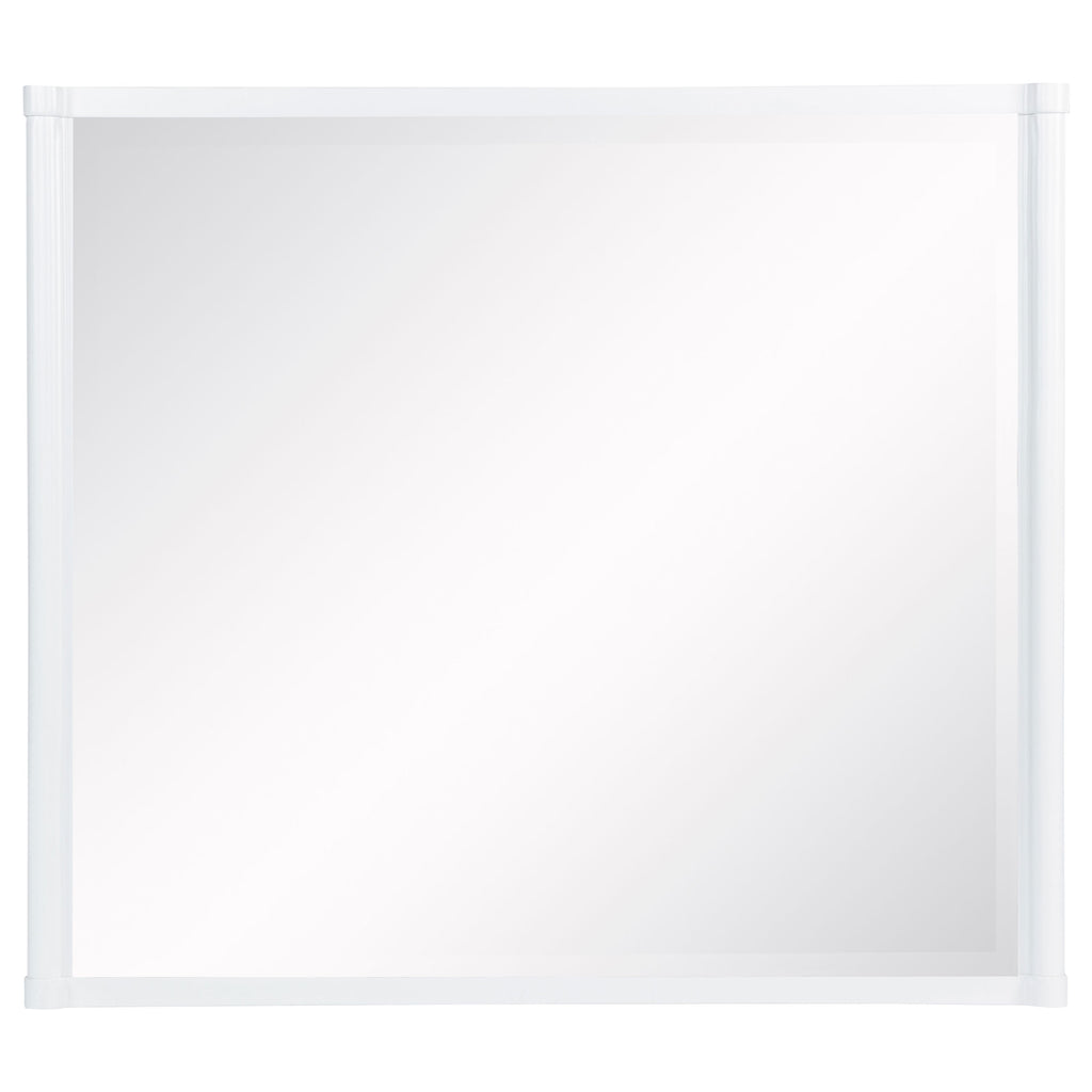 This bedroom set combines soft curvature and linear polish in a clean modern silhouette. Each piece features elongated brushed nickel pulls and subtle vertical tube accents that frame smooth white surfaces. The bed softens the look with a light grey upholstered headboard and footboard, adding contrast and comfort. Built from solid rubberwood, engineered wood, and laminate veneer, this set balances elegance with practical everyday function. Key Features: • Bedroom set features rounded silhouettes and clean lines for modern storage and sleep • White finish pairs with brushed nickel pulls and vertical metal tube detailing • Bed includes light grey fabric panels with soft foam for cushioned comfort • Felt-lined top drawers offer tinted interiors and integrated charging access • Drawers glide on 45mm metal runners with dovetail joints for smooth daily use • Built from solid Asian hardwood, engineered wood, and a smooth laminate veneer