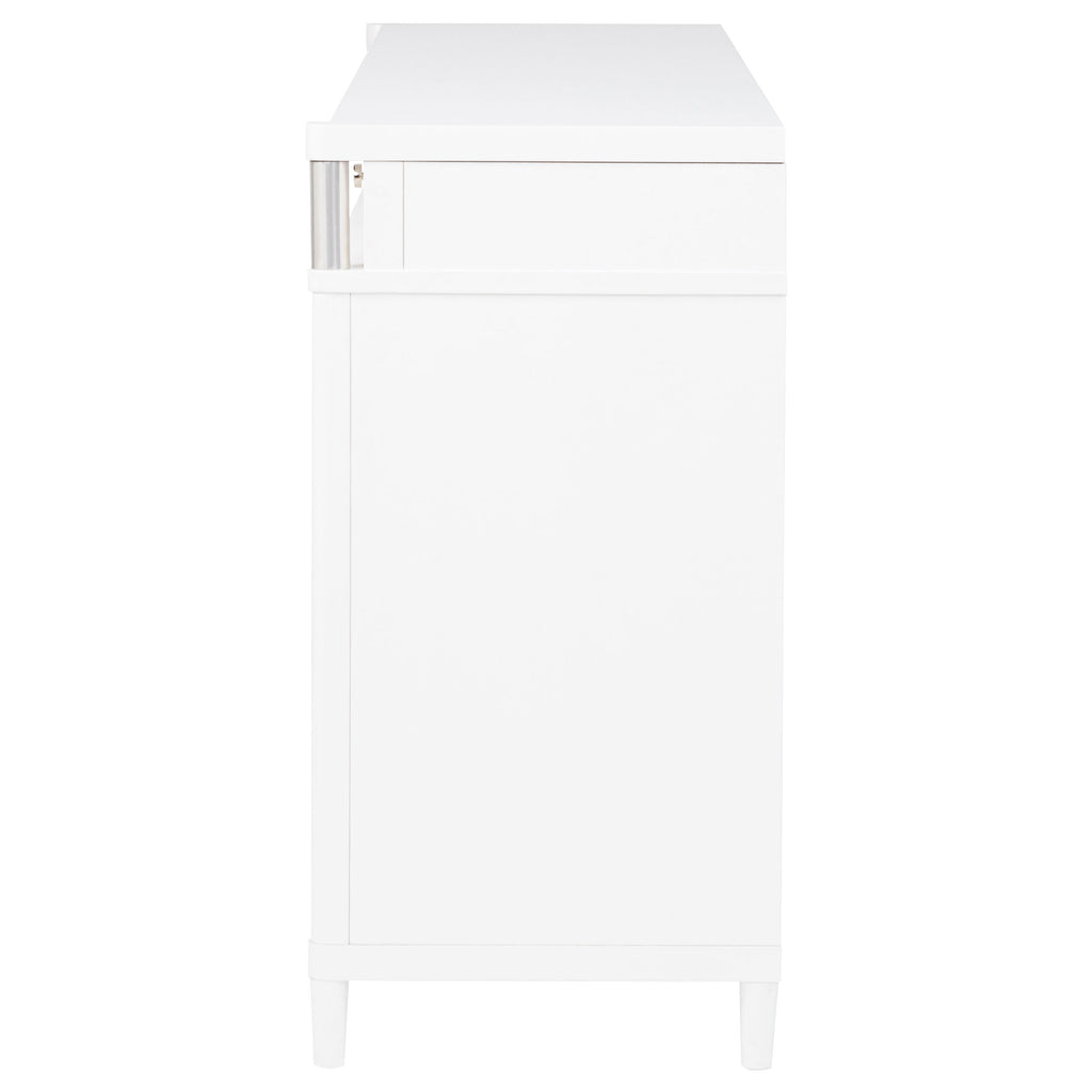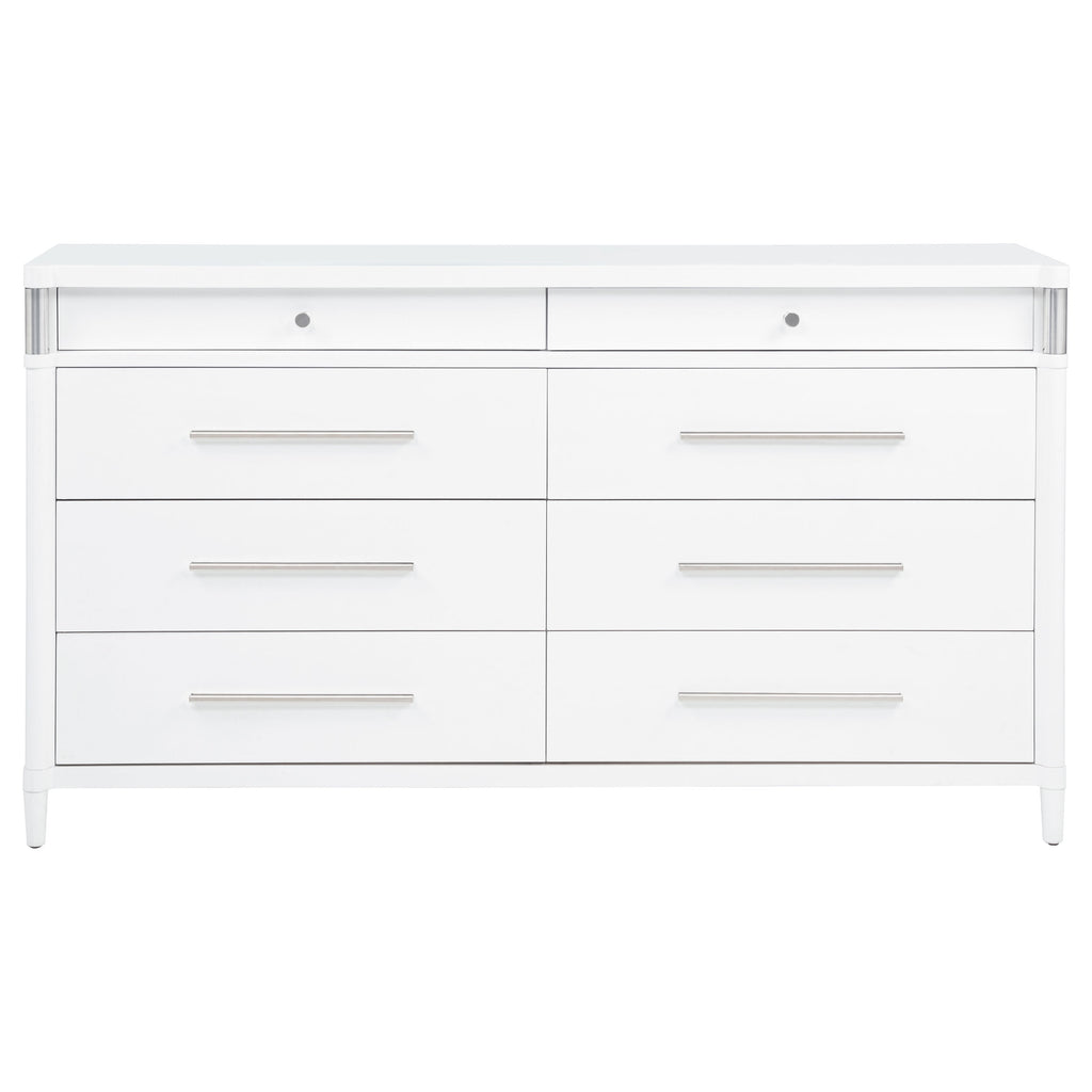 This eight-drawer dresser exudes modern sophistication through a sleek silhouette and softened edges. Elongated brushed nickel pulls and vertical tube accents create visual interest while enhancing the dresser’s clean structure. Built from solid rubberwood, engineered wood, and finished with a smooth laminate veneer, it offers ample storage and felt-lined top drawers. Designed for refined function in any contemporary bedroom. Key Features: • Eight-drawer dresser with softened corners and a clean-lined, modern silhouette • White finish contrasts with brushed nickel pulls and vertical metal tube accents • Felt-lined top drawers with tinted interiors provide secure, organized storage • Drawers feature dovetail joints and glide smoothly on heavy-duty metal glides • Made from solid rubberwood, engineered wood, and smooth laminate veneer • Fully assembled dresser includes integrated tip-over restraint for added safety