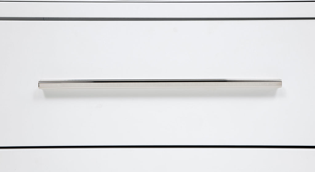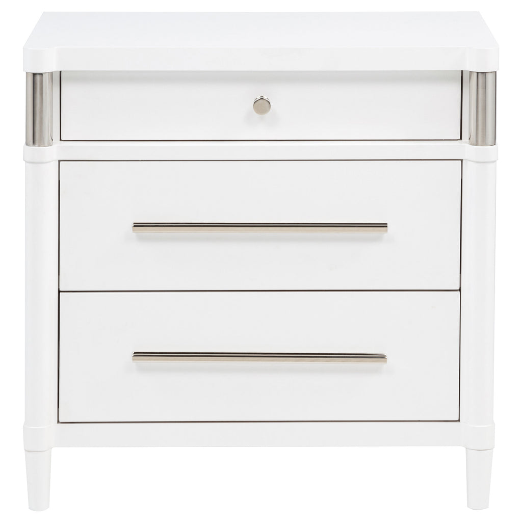 This three-drawer nightstand blends subtle curves with thoughtful convenience. Vertical metal accents and brushed nickel pulls contrast a white finish, while the felt-lined top drawer includes discreet cord access for device charging. Built from solid rubberwood, engineered wood, and a smooth laminate veneer, it offers smooth drawer movement and refined bedside storage in a compact silhouette. Key Features: • Three-drawer nightstand with curved edges and clean profile for modern bedside storage • White finish pairs with brushed nickel pulls and sleek vertical tube accents • Top drawer includes felt lining, tinted interior, and hidden cord access for charging • Drawer boxes feature dovetail joints and glide on 45mm heavy-duty metal runners • Built from solid rubberwood, engineered wood, and smooth laminate veneer • Fully assembled nightstand includes tip-over restraint for dependable bedside use