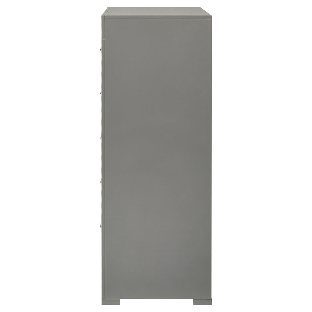 Organize your wardrobe in style with this contemporary chest. The high gloss finish and 3-dimensional diamond tile emboss provide a chic, modern look that enhances any bedroom decor. Five spacious drawers offer ample storage for clothing and linens, each with felt lining in the top drawers to protect your delicate items. The chest is built with robust materials and English dovetail joinery, ensuring durability and smooth functionality. This piece is both practical and stylish, perfect for a modern home.