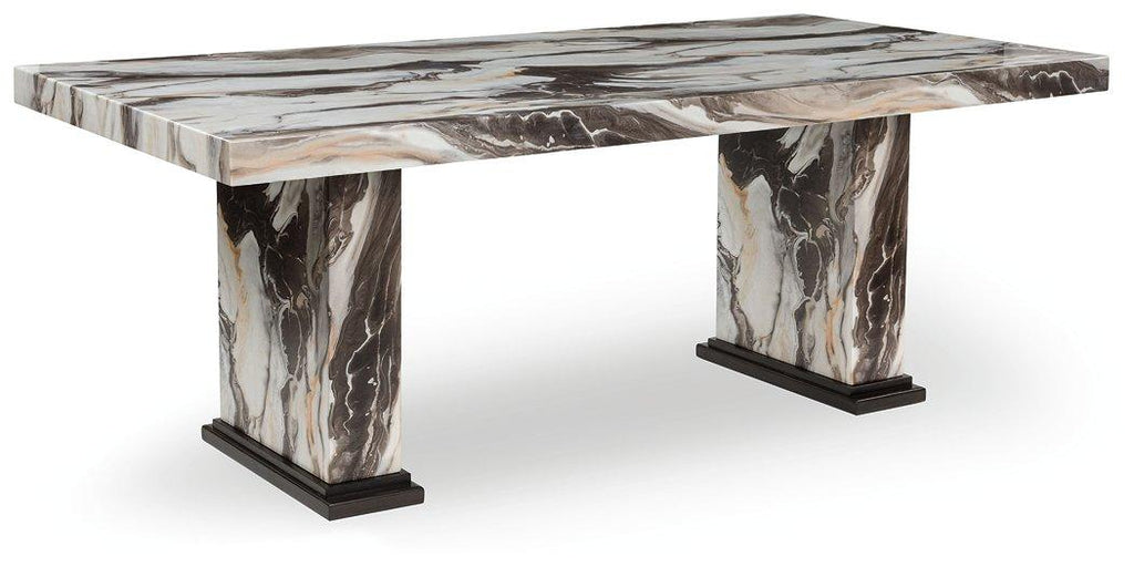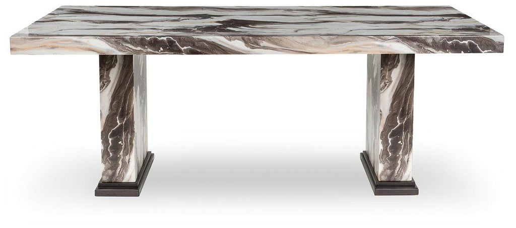 - Tabletop and double pedestal base with replicated marble pattern; polyester topcoat for lasting beauty