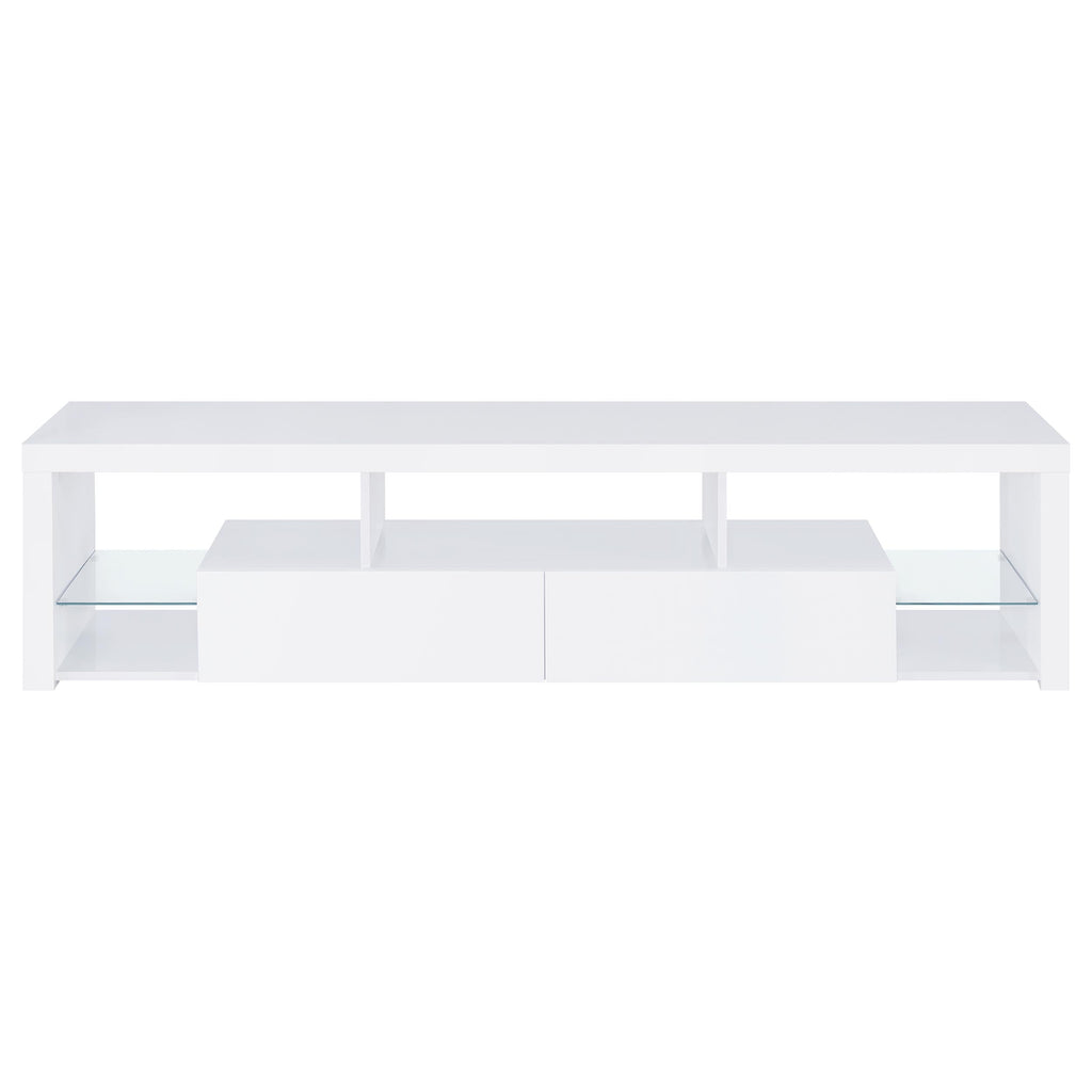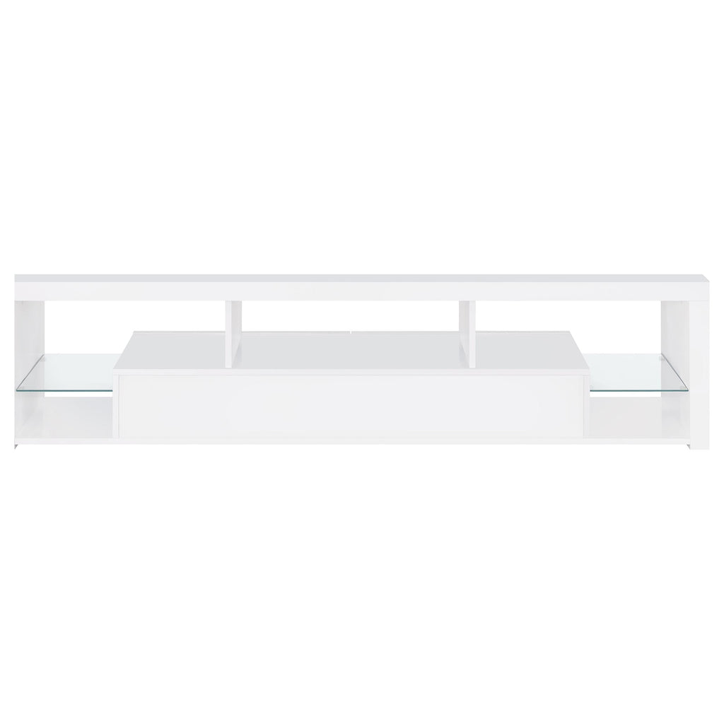 Elevate your entertainment arena with our sleek, modern TV stand. Drenched in a pristine glossy white-on-white finish, it radiates sophistication, accentuated by clear glass details. Its soft-close drawers ensure smooth operation, while glass shelves present a chic display option. Generous storage compartments cater to all your media needs. To enhance the ensemble, the set comes with matching media towers, amplifying storage capacity and offering a unified, stylish appearance. This combo not only meets functional demands but also serves as a captivating focal point in any contemporary space.