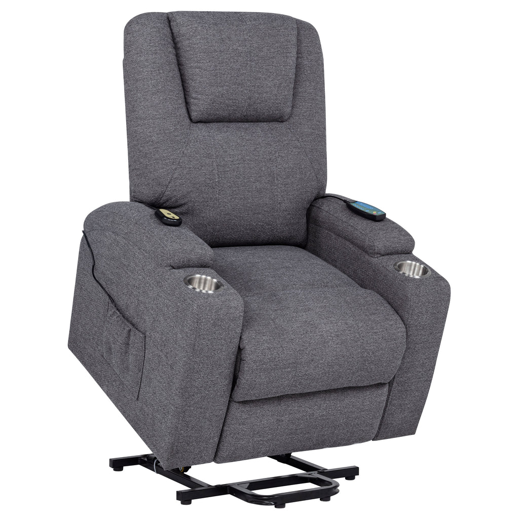 Gracefully merging comfort, function, and care, this power lift massage chair offers a luxurious retreat at the touch of a button. Wrapped in soft chenille, its plush silhouette supports you with gentle recline, heated massage, and a smooth lift mechanism—perfect for easing into or out of relaxation. Dual stainless steel cup holders and side storage pockets provide thoughtful utility, making it a serene and supportive haven for everyday unwinding. Key Features: • Power lift massage chair in dark grey chenille offers wired remote-controlled recline and lift • Heat and vibration massage functions provide soothing comfort at the touch of a button • Stainless steel cup holders on both arms keep beverages secure and accessible • Side storage pockets on both sides hold remotes, reading material, or small essentials • Plush cushioning with supportive back and pillow-top arms enhances everyday comfort • Ideal for those seeking independence, recovery support, or elevated daily relaxation