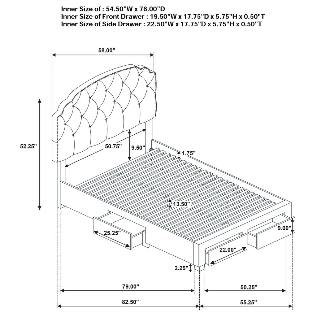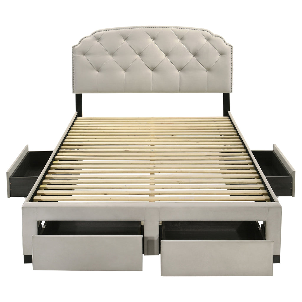 Indulge in comfort and utility with this platform storage bed, where graceful design meets everyday practicality. A tufted velvet headboard with gentle curves and nailhead trim brings refined elegance, while four built-in drawers offer generous hidden storage. Expertly crafted from rubberwood, engineered wood, and foam, this fully slatted frame eliminates the need for a foundation. It's a sophisticated solution for streamlined, serene living. Key Features: • Queen platform bed with scalloped tufted headboard for graceful tailored dimension • Cream velvet upholstery with button tufting and nickel nailhead trim for elegance • Includes four spacious drawers for concealed clothing or linen storage solutions • Fully slatted base supports mattress directly with no foundation or box spring • Built from rubberwood and engineered wood for stability, durability, and strength • Foam-filled headboard adds comfort while combining classic detail with function