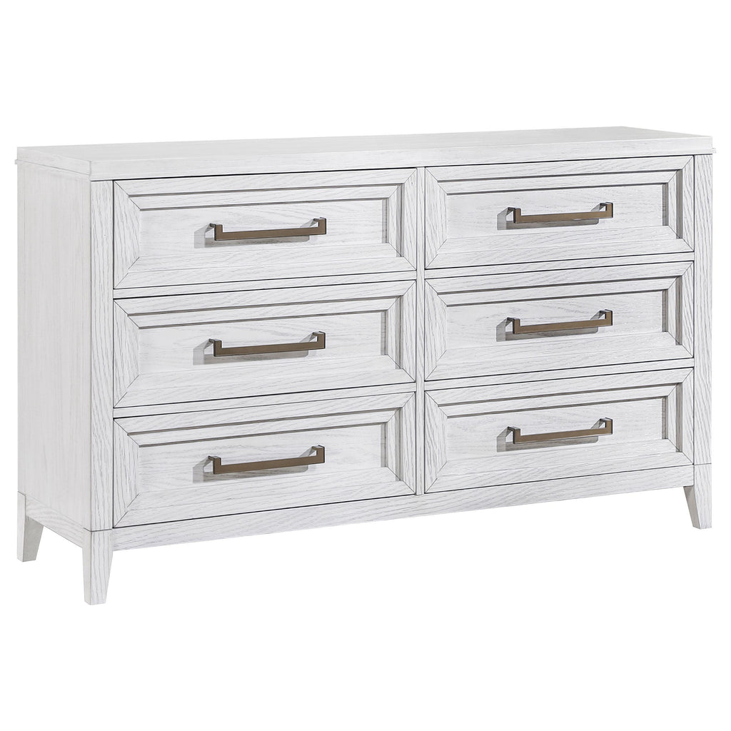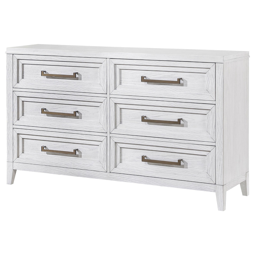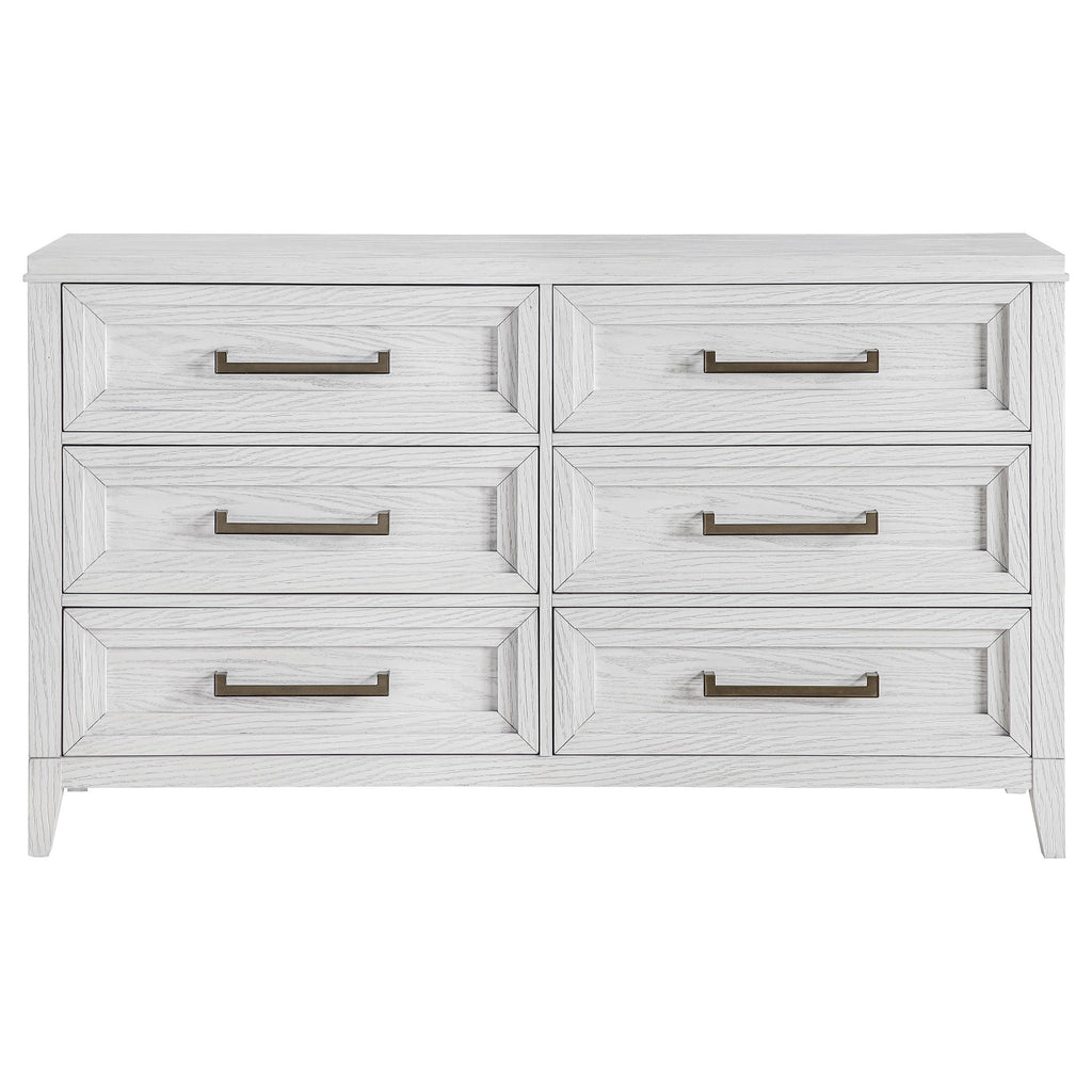 Light distressing offers depth and dimensionality to a modern six-drawer dresser. Perfect for clothing and other accessories, it features a double profile with three drawers on each side. A white finish allows wood grain details to show through, creating organic character and texture. Drawer fronts are a stepped design that adds artistry, with long antique brass toned pulls that add contrasting depth. use the wide top for personal effects like a jewelry box or valet and framed photos. Key Features: • Add easy bedroom storage with six roomy drawers in a modern dresser • Distressed white finish allows light wood grain detail to show through, adding character • Stepped drawer front design creates depth and dimensional character • Long bar pulls add contrast with a antique brass toned finish and angular design • Includes a tip-over restraint for added safety and peace of mind