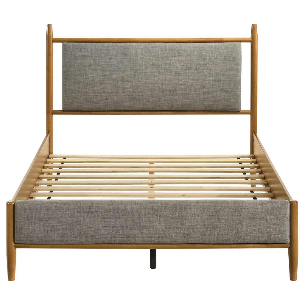 Elevate your retreat with this platform bed, where warm wood and tailored upholstery meet in harmony. The clean-lined frame highlights its mid-century modern influence, paired with a gently padded headboard for cushioned support. Crafted from rubberwood, engineered wood, and foam-filled fabric, it ensures stability without the need for a foundation. Ideal for restful nights and timeless style, this platform bed blends structure with soft sophistication. Key Features: • Queen platform bed with clean lines and padded headboard for tailored support • Light brown frame highlights wood grain for warmth and mid-century character • Streamlined silhouette blends retro charm with modern minimalism for versatility • Foam-filled fabric upholstery softens the look with subtle texture and comfort • Crafted from rubberwood and engineered wood for lasting strength and stability • Foundation-free platform design with supportive slats for reliable mattress use