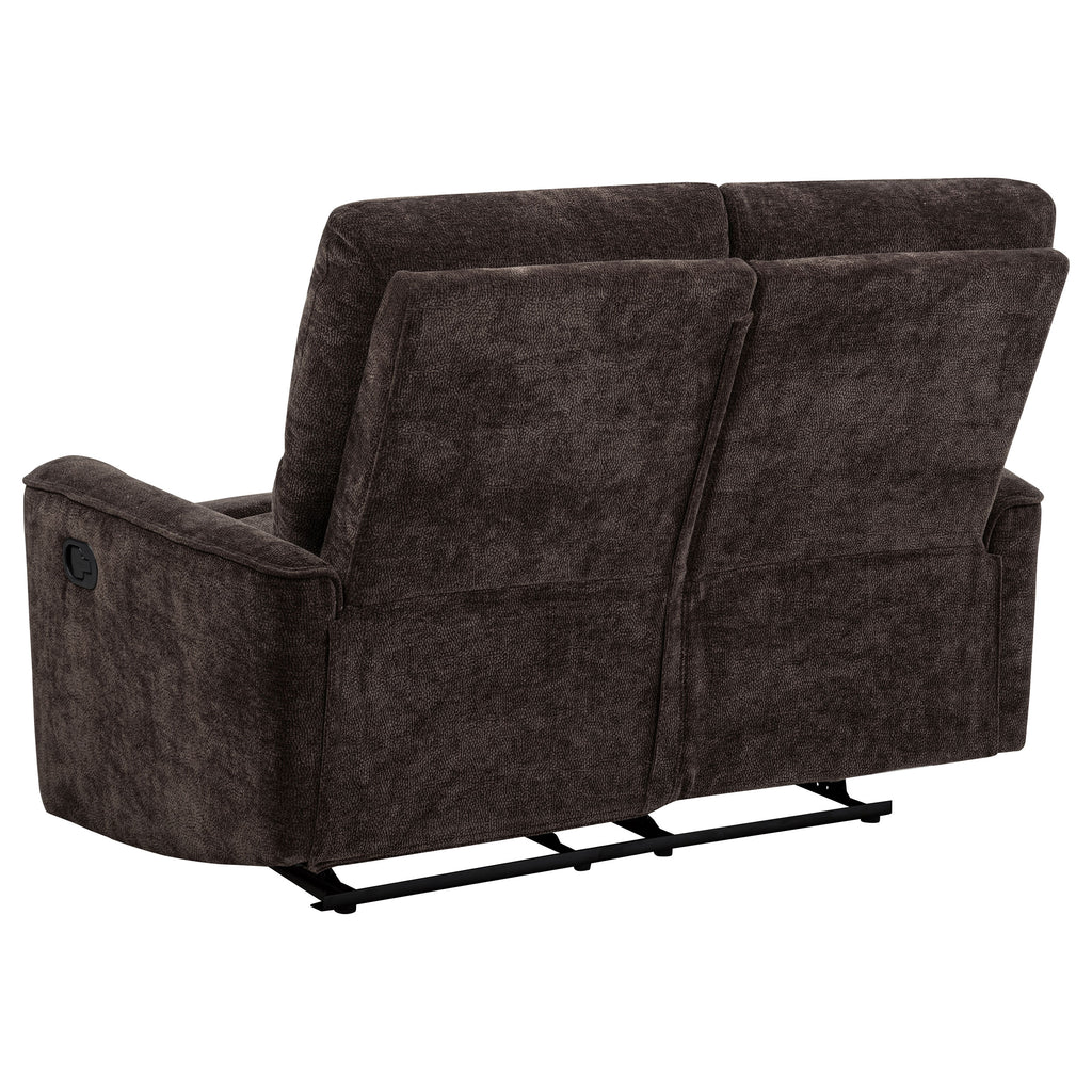 Softly tailored and built for comfort, this reclining loveseat invites everyday relaxation with ease. Deep cushions and plush chenille upholstery wrap you in warmth, while channel tufting along the back enhances support and flow. Smooth manual recliners extend at your fingertips, offering personalized comfort from seat to seat. Framed in durable wood and metal, it brings a perfect balance of softness, structure, and restorative ease to any living room. Key Features: • Reclining loveseat with manual recline and plush cushions for laid-back comfort • Dark brown chenille upholstery offers a cozy texture with soft, inviting warmth • Channel-tufted backrests deliver contouring support and casual structure • Wide padded arms provide comfort and relaxation in any position • Crafted from fabric, metal, plywood, and foam for dependable use • Ideal for casual living rooms seeking softness, ease, and functional style