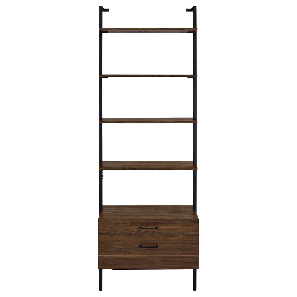 Elevate your home with this modern three-piece bookshelf set, combining sleek design with practical storage solutions. This set features two open shelf bookcases and one bookcase with drawers, each offering a refined and airy ambiance that complements any contemporary space. The open shelves are perfect for showcasing books, decor, and personal treasures, all set within a black metal frame that adds stability and minimalist appeal. The central bookcase includes two drawers, providing hidden storage to keep your space organized and clutter-free. Finished in a warm walnut tone, this versatile bookshelf set is ideal for creating a cohesive, stylish display in your living room, home office, or dining area.