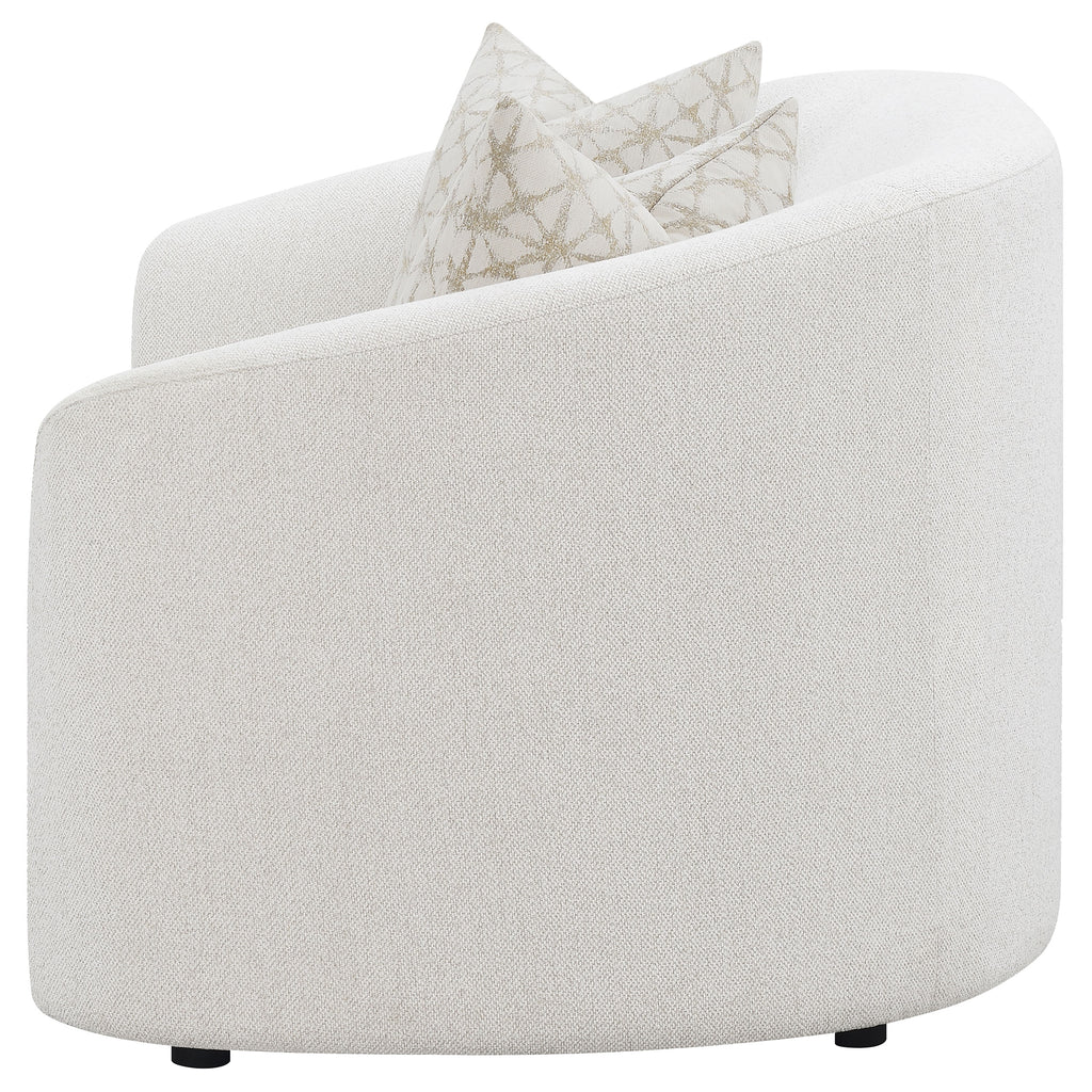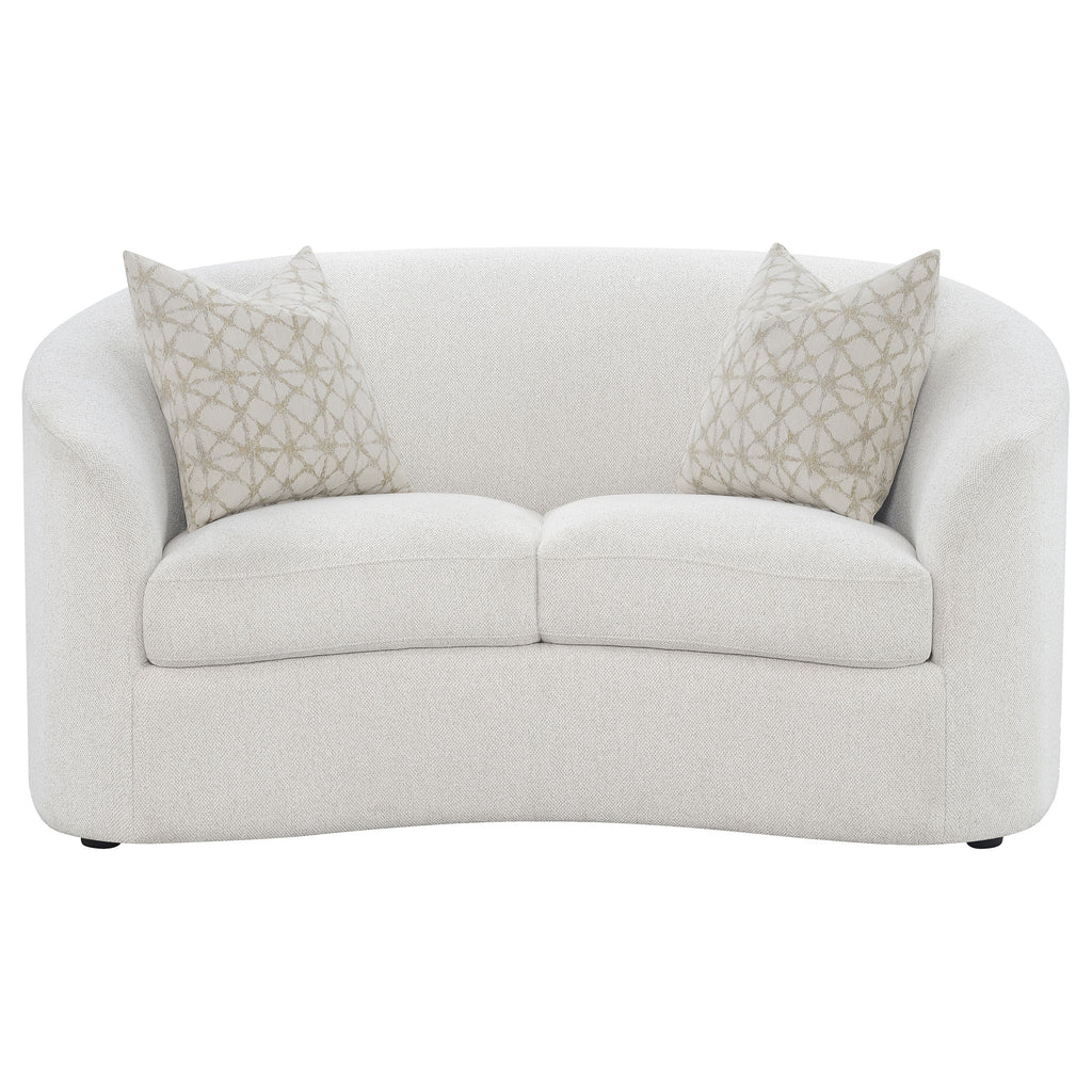 Gracefully contoured and inviting, this boucle loveseat brings soft sophistication to any space. The curved silhouette and sloped armrests offer a modern nod to mid-century design, while the latte boucle fabric provides tactile warmth and texture. Plush seat cushions ensure lasting comfort, complemented by accent pillows filled with premium faux down for a touch of luxury. Supported by discreet black legs, this loveseat balances elegance and coziness, creating a perfect retreat for contemporary living rooms._x005F_x000D_ Key Features: • Curved loveseat wrapped in soft latte boucle upholstery for texture • Sloped armrests and rounded edges highlight graceful contours • Two plush seat cushions deliver superior comfort and support • Tight back design maintains a smooth, tailored modern appearance • Accent pillows with faux down fill enhance softness and appeal • Perfect for compact living areas seeking warmth and sophistication