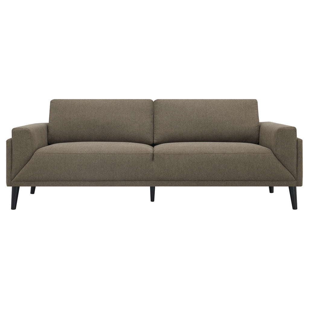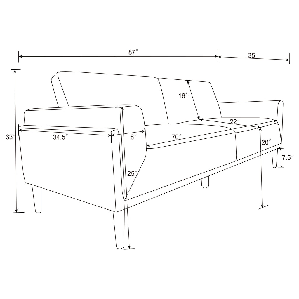 Welcome to the pinnacle of modern design with our sofa collection, where elegance meets innovation in a "frame within a frame" concept. This series, draped in a chic fabric, showcases an exquisite blend of clean lines accentuated by detailed topstitching. The track arms, enhanced with mitered front accents, further amplify its contemporary aesthetic. Prioritizing your relaxation, these sofas come equipped with reversible back cushions and a pocket coil seat construction, guaranteeing both coziness and lasting support. Elevating the design even further are the tall, black cylinder-shaped wooden legs, adding a touch of sophistication. This collection is not just about seating; it's an embodiment of style and comfort, curated for the modern home.