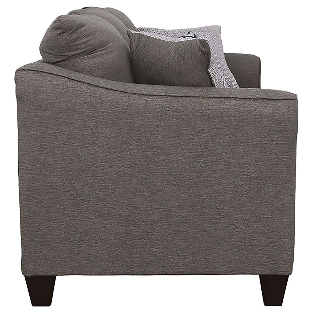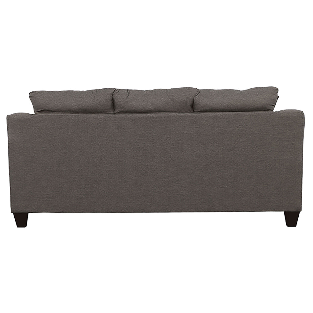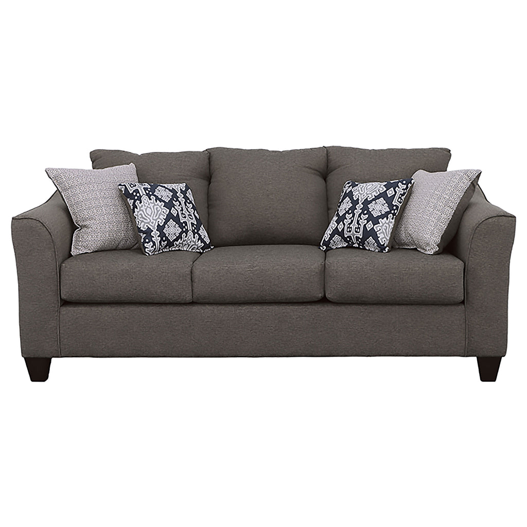 Gracefully blending timeless design and comfort, this sofa anchors any living space with a clean silhouette and flared arms. Plush foam cushions provide supportive comfort, while tailored upholstery adds a refined touch. Its inviting form and accent pillows create an effortlessly balanced look suited for casual and modern interiors alike. A perfect centerpiece for conversation or relaxation, this sofa elevates comfort with enduring style._x005F_x000D_ Key Features: • Flared-arm sofa wrapped in smooth sand-tone upholstery for a soft look • Polyester fabric and plush foam cushions ensure enduring comfort • Rounded armrests enhance both style and relaxation appeal • Accent pillows deliver pattern contrast for a balanced composition • Tapered espresso legs ground the design with visual definition • Durable tailoring keeps the sofa refined and contemporary