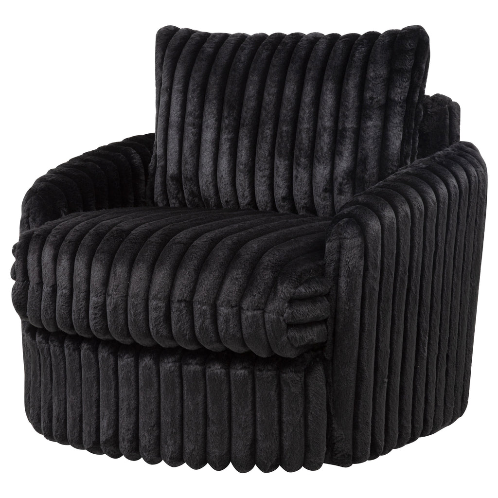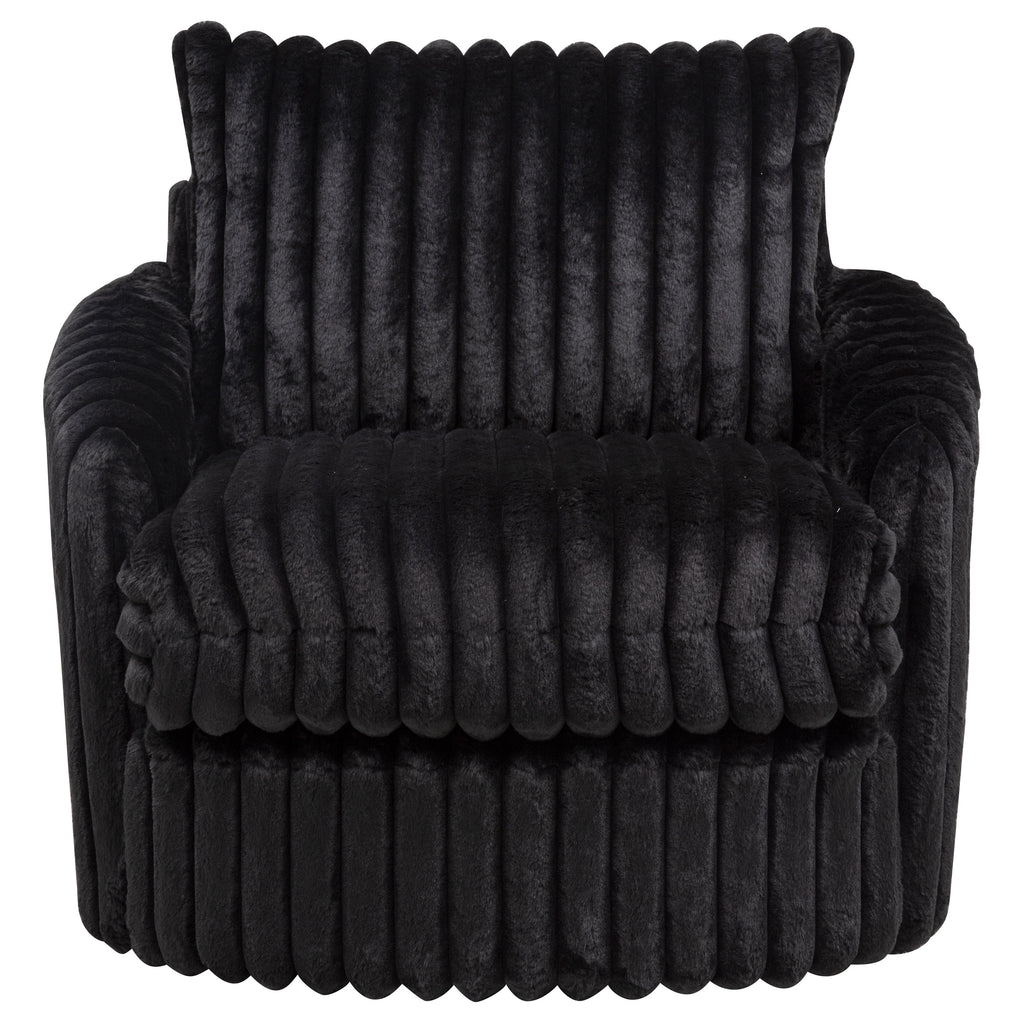Contoured for comfort and wrapped in plush texture, this swivel chair invites relaxed movement with a soft, sculptural silhouette. Deep channel tufting traces every curve, from the wide seat to the tailored backrest and arms. Fully upholstered in ribbed corduroy and built with layered foam, this lounge chair rotates 360 degrees for flexible conversation. Ideal for modern living rooms, reading corners, or cozy bedrooms. Key Features: • Swivel chair in ivory corduroy features deep channel tufting and soft sculptural shaping • Full 360-degree swivel base allows flexible movement in open or compact spaces • Thick foam cushions provide a plush seating experience with lasting support • Fully upholstered arms and back offer a continuous wrap of ribbed corded texture • Framed in engineered wood for durability and built-in strength beneath soft contours • Modern swivel lounge chair suits bedrooms, living rooms, or cozy reading spaces