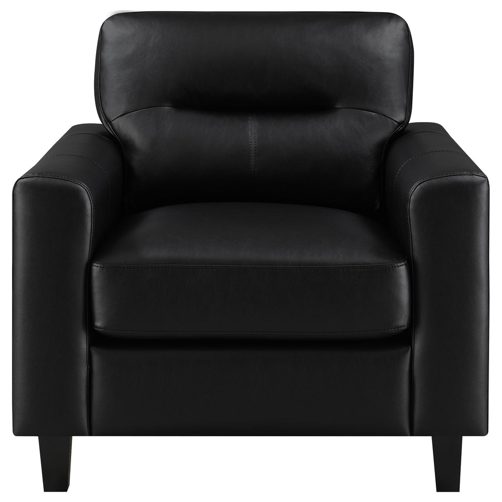 This lounge chair brings focused simplicity to the living room with strong lines and soft detail. Wide track arms wrap around the seat’s plush center, where smooth upholstery flows across each surface with quiet ease. Subtle tailoring enhances its sculpted calm. Whether placed solo or paired within a set, it delivers comfort and structure in equal measure—grounded, timeless, and always welcoming. Key Features: • Accent chair with track arms and supportive seat for individual relaxation • Black leatherette finish wraps seat in smooth, easy-care upholstery • Defined edges and topstitching create bold lines and sharp visual form • Straight legs in matching black keep focus on the structured silhouette • Constructed with plywood, foam cushions, and synthetic leather upholstery • Works as a standalone chair or integrated into a full seating arrangement