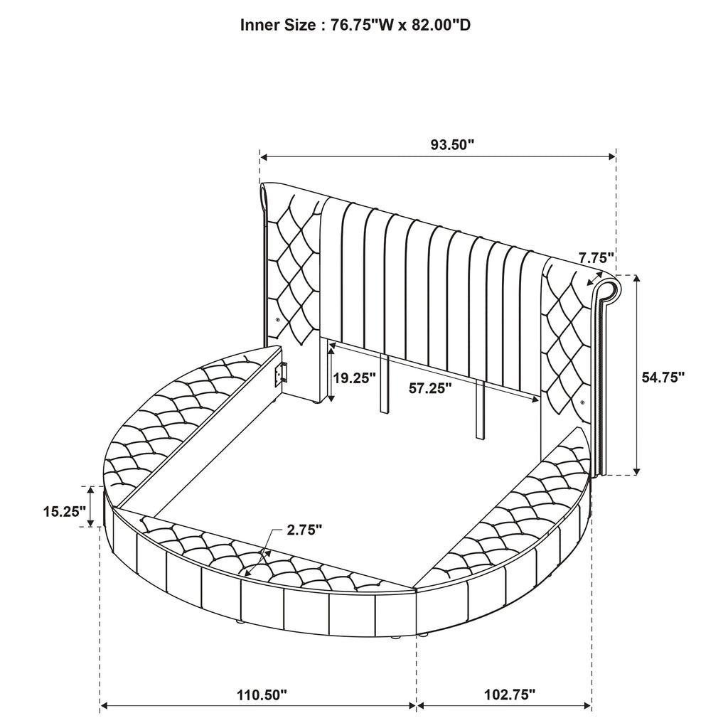 Make a bold statement in your bedroom with this luxurious round-bench bed, designed to elevate your space into a glamorous retreat. The elegant ivory bouclé fabric features exquisite channeled tufting, adorned with sparkling acrylic buttons that shimmer with every glance. Adding to the functionality, USB charging ports are conveniently located on both sides of the headboard, allowing you to stay connected without leaving the comfort of your bed. The design brings a unique blend of modern luxury and timeless elegance, perfect for creating a dramatic yet cozy atmosphere.