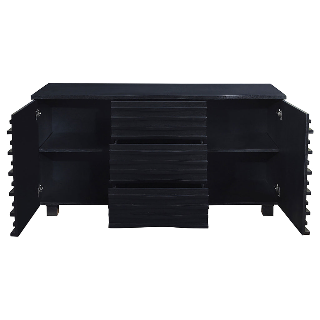 This sideboard showcases bold modern styling with a striking wave-front design across its drawers and doors. A sleek rectangular silhouette finished in rich black enhances its artistic profile while providing versatile storage. Crafted from solid rubberwood, engineered wood, and oak veneer, it balances strength and elegance. With spacious interior shelving and three drawers, it neatly organizes dining room essentials, linens, or living room accessories while elevating any contemporary setting. Key Features: • Sideboard cabinet in black finish with wave front design, three drawers, oak veneer build • Modern black sideboard with textured wave panels, engineered wood, and oak veneer top • Black finished sideboard with three drawers, two doors, and concealed adjustable shelves • Contemporary black sideboard crafted from solid rubberwood and engineered wood panels • Black finish buffet cabinet with oak veneer, wave design, and versatile interior storage • Bold black sideboard with sculpted drawer fronts, sturdy hardwood frame, and shelving inside