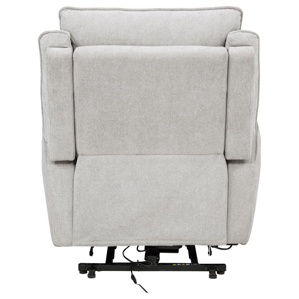 Graceful support meets modern serenity in this thoughtfully designed dual power lift recliner. Draped in dove grey chenille, its softly contoured silhouette cradles the body with plush foam and gentle curves. A wired remote brings every comfort within reach, offering smooth power recline, adjustable headrest, and lift-assist functionality. Dual USB ports, including both USB-A and USB-C, add everyday convenience to this versatile and comfortable recliner. Key Features: • Dual power lift recliner with smooth lift, recline, and headrest adjustment for everyday ease • Dove grey chenille upholstery delivers plush comfort and a clean, versatile aesthetic • Wired remote includes USB-A and USB-C charging ports for convenient device access • Quiet motorized transitions offer seamless movement with precise fingertip control • Plush foam and fiber padding cushions the frame for enhanced relaxation and comfort • Engineered wood and metal frame construction provides reliable, long-lasting support
