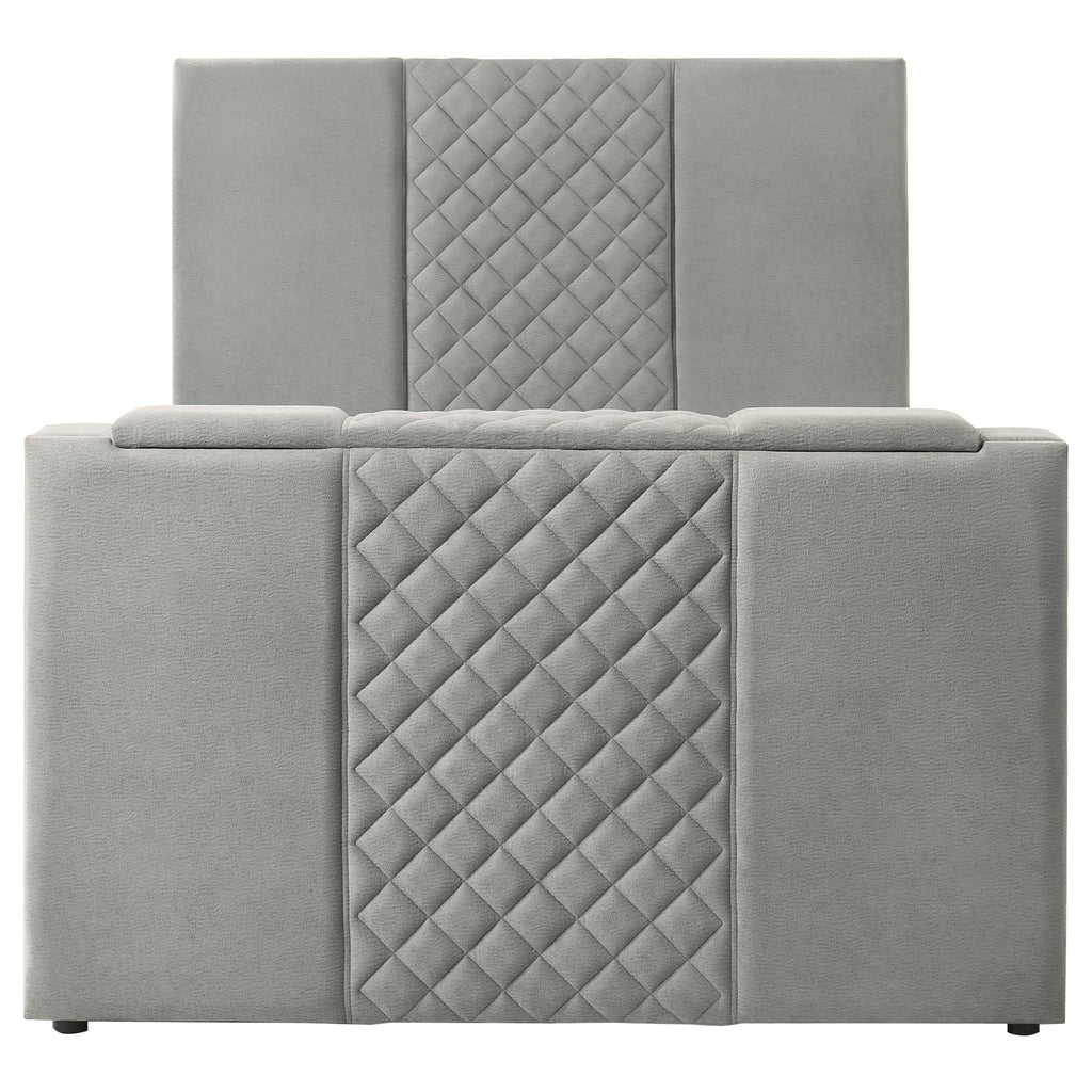 This bed is where elegance meets indulgence, inviting you to unwind in a world of luxury and innovation. A quilted velvet headboard adds a soft, sculptural presence, while the footboard conceals a motorized TV lift that glides open with a wireless remote. Designed to cradle screens up to fifty inches, it includes a discreet power outlet for seamless connectivity. Wrapped in plush velvet and framed in foam-padded wood, this bed redefines rest with a whisper of modern romance. Key Features: • Queen bed with quilted velvet headboard adds a soft touch to modern panel design • Velvet upholstery in grey contrasts with sleek black legs for a modern finish • Footboard features motorized TV lift supporting up to fifty-inch screen sizes • Wireless remote included for smooth, discreet media elevation and control • Built-in power outlet includes three AC outlets for convenient plug-and-play use • Engineered wood frame padded in foam supports mattress and box foundation
