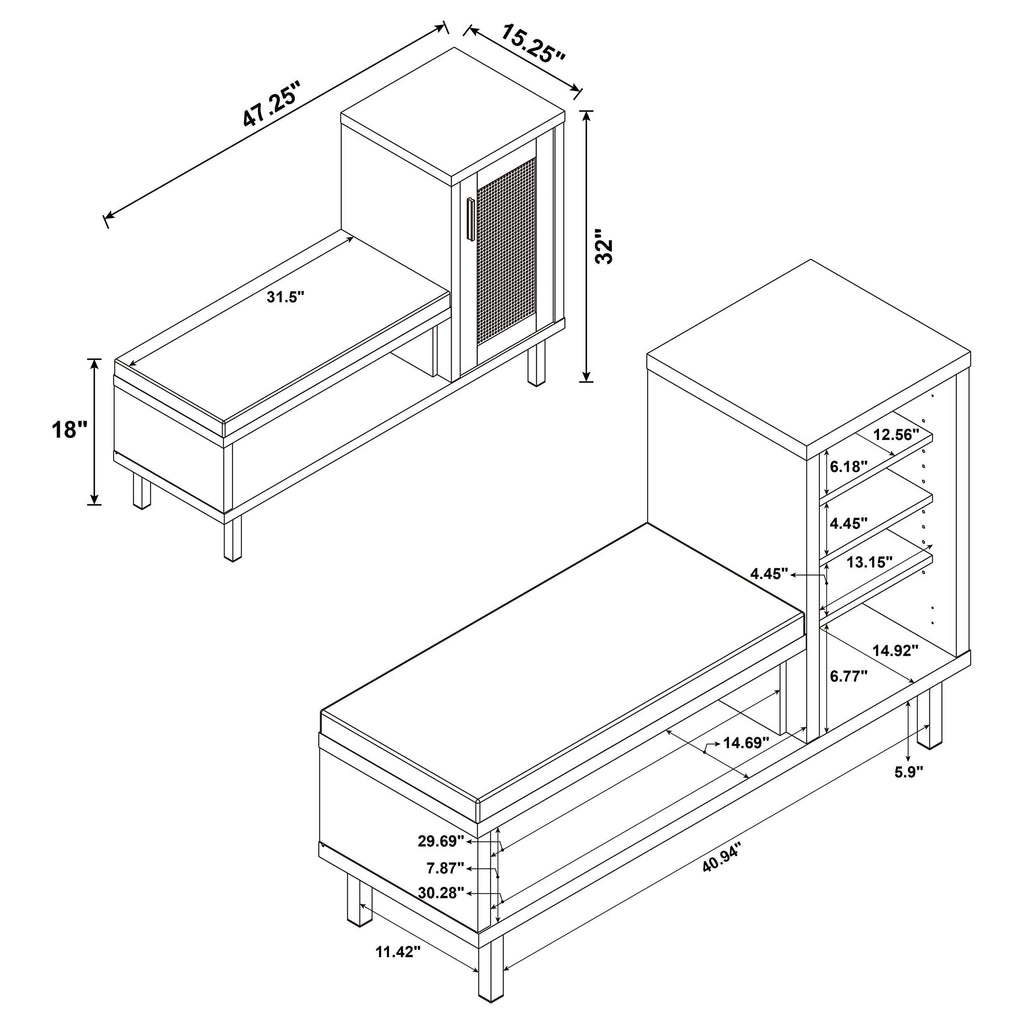 Elevate your entryway with this multifunctional shoe storage bench, elegantly merging form and function. Its engineered wood frame is finished with a durable natural oak colored wood-look laminate veneer, while a black faux leather cushion, foam-padded for comfort, tops the seating area. On one side, a cane-style metal panel door opens to reveal four tiers of shelving, neatly organizing your footwear. Supported by black powder-coated metal legs, this versatile piece delivers both style and practicality in one refined package. Key Features: • A multifunctional shoe storage bench in natural oak finish with integrated seating • Black faux leather upholstered cushion for plush comfort • Cane-style metal door panel concealing four tiers of shoe shelves • Engineered wood construction with a protective laminate veneer • Sturdy black powder-coated metal legs ensure stability and durability • Perfect for maintaining a tidy, welcoming entryway or hallway