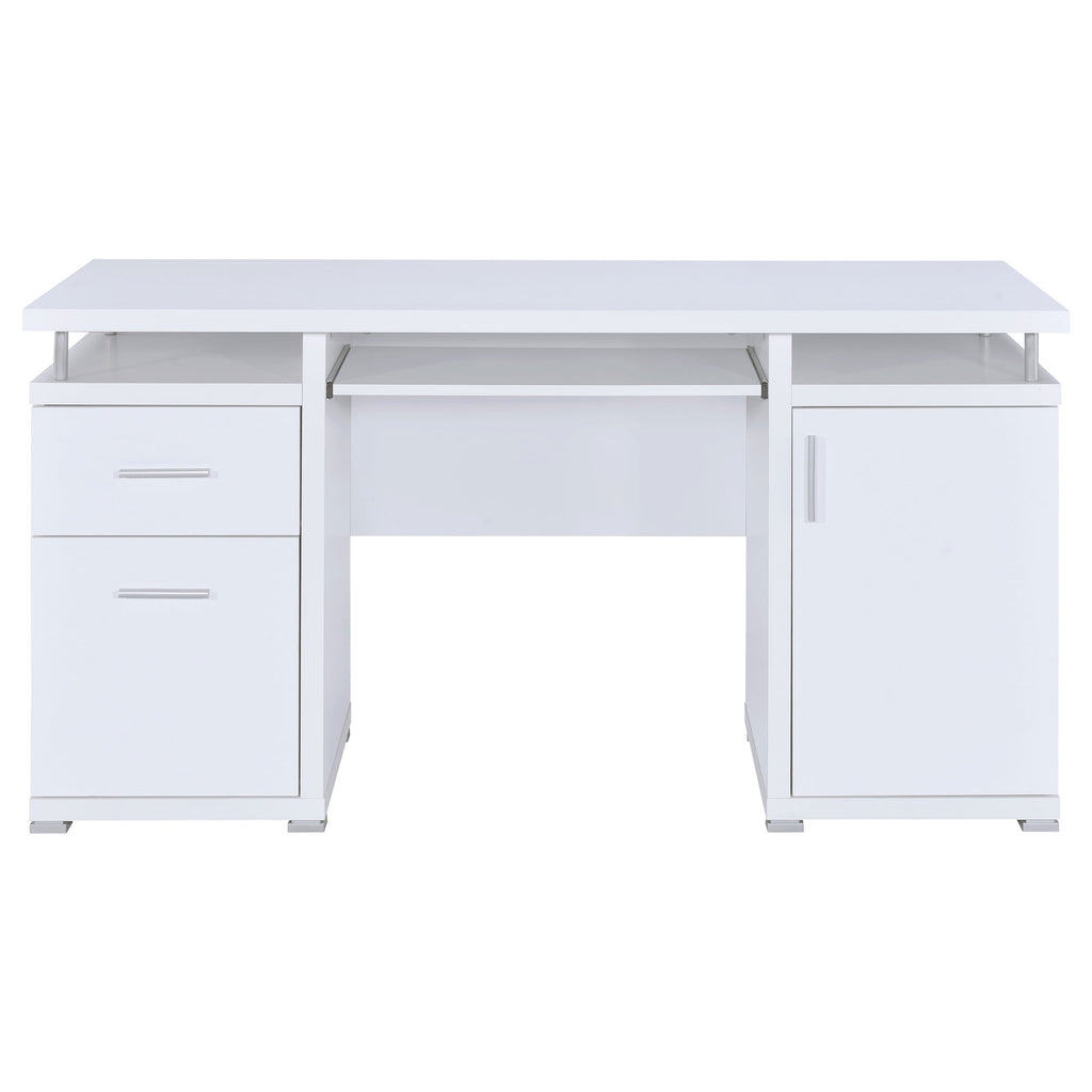 Upgrade your home office with sleek style and fabulous functionality. This handsome office desk has everything you need to be productive. Its large cabinet features an adjustable shelf for convenient storage. It includes a large file cabinet that fits legal and letter size files, as well as a smaller top drawer and keyboard tray. With a deep, rich finish of cappuccino, this desk is a stylish addition to any office. Key Features: • Office desk with cappuccino finish and modern rectangular work surface • Two drawers include a utility drawer and a file drawer for organized storage • Right-side cabinet with adjustable shelf provides versatile enclosed storage • Slide-out keyboard tray preserves desktop space and improves workflow • Silver-finished hardware and metal risers create a clean, professional look • Crafted from engineered wood, melamine paper, and honeycomb board layers